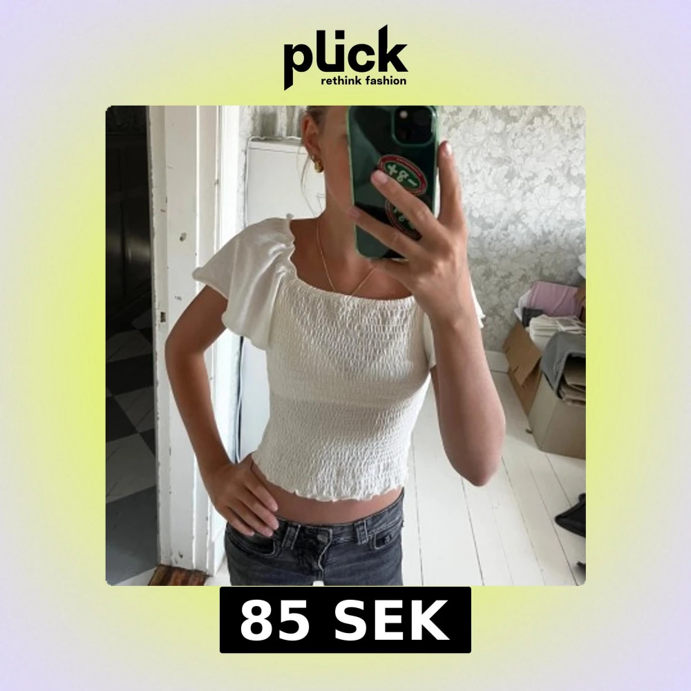 Supersöt vit blus med smockad kropp och volangiga, korta ärmar. Toppen har fyrkantig ringning och kan bäras både offshoulder och på axlarna. Croppad modell med vågig kant nertill, perfekt till jeans eller kjol.