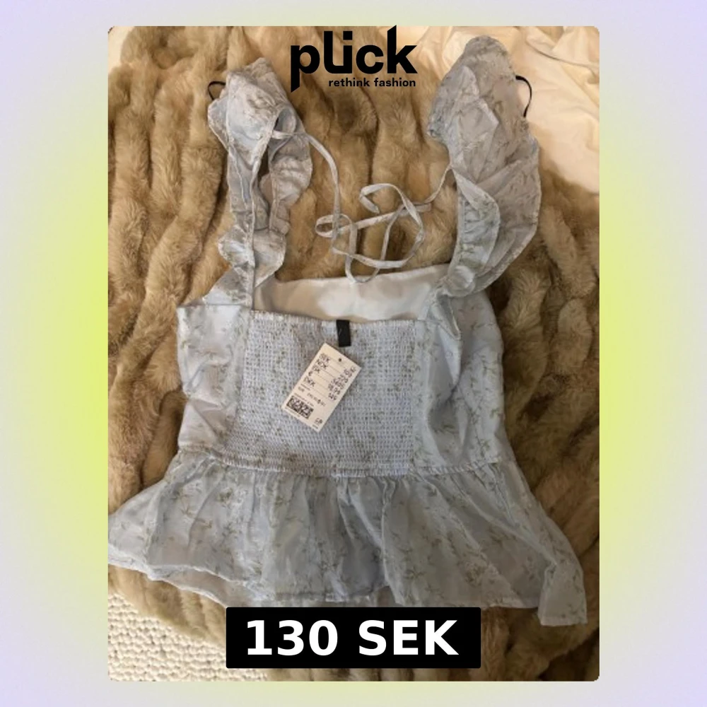 Supersöt ljusblå blus med blommigt mönster från H&M Divided. Toppen har volangdetaljer vid axlarna, knytning i ryggen och smockad midja. Materialet är lätt och luftigt, perfekt för vår och sommar. Passformen är normal och toppen är ärmlös med breda volangaxelband.