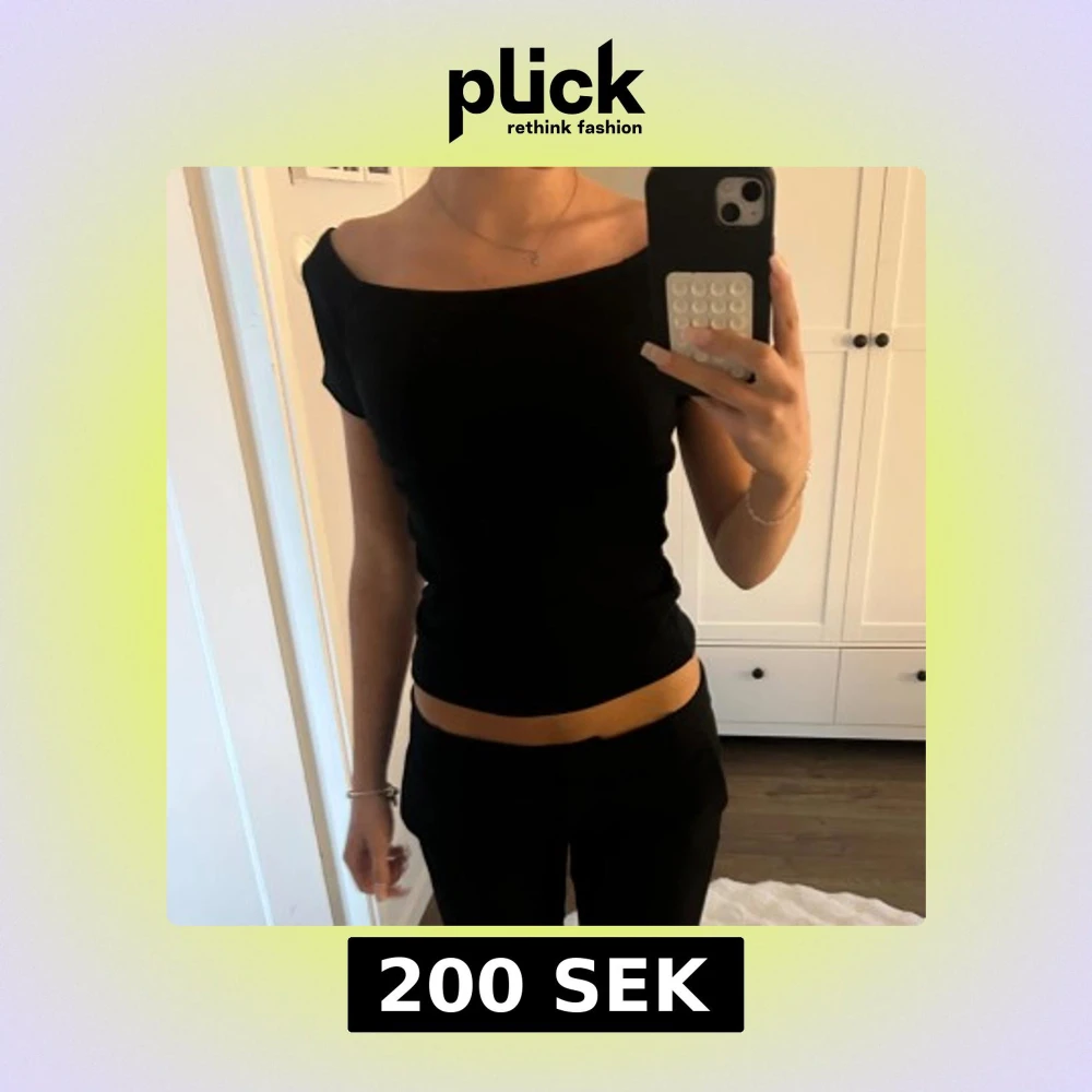 Säljer en svart offshoulder topp med korta ärmar och smickrande tight passform. Toppen har en stilren, rak halsringning som visar axlarna och är croppad i modellen. Materialet är mjukt och stretchigt bomull, perfekt för en trendig look.