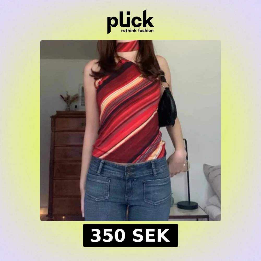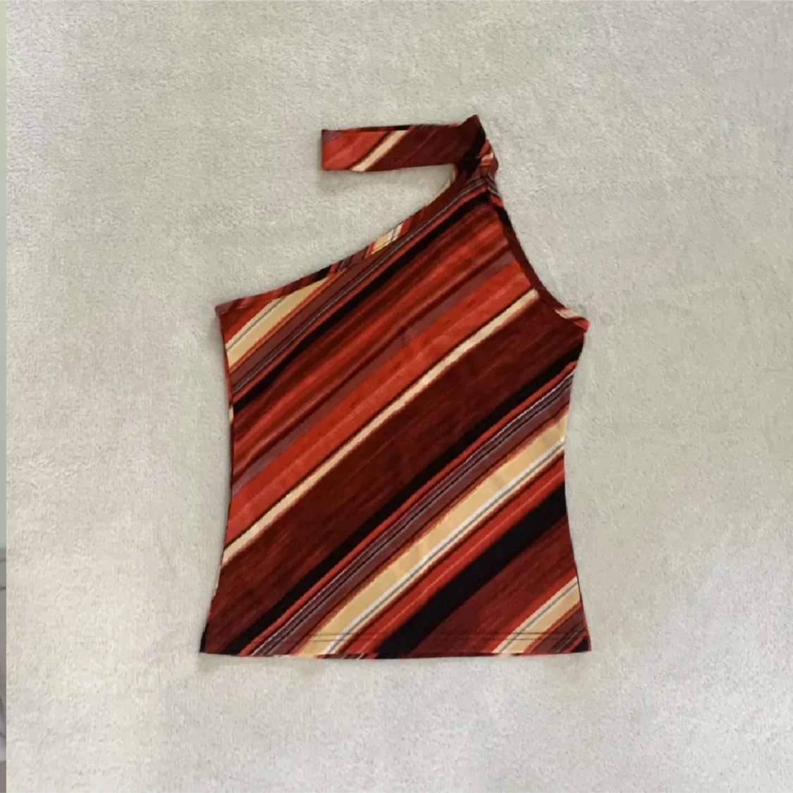 Säljer en snygg oneshoulder topp med diagonalrandigt mönster i rött, orange, beige och svart. Toppen har en cool asymmetrisk hals och medföljande matchande halsband. Stretchigt material som sitter tight och ger en trendig look.