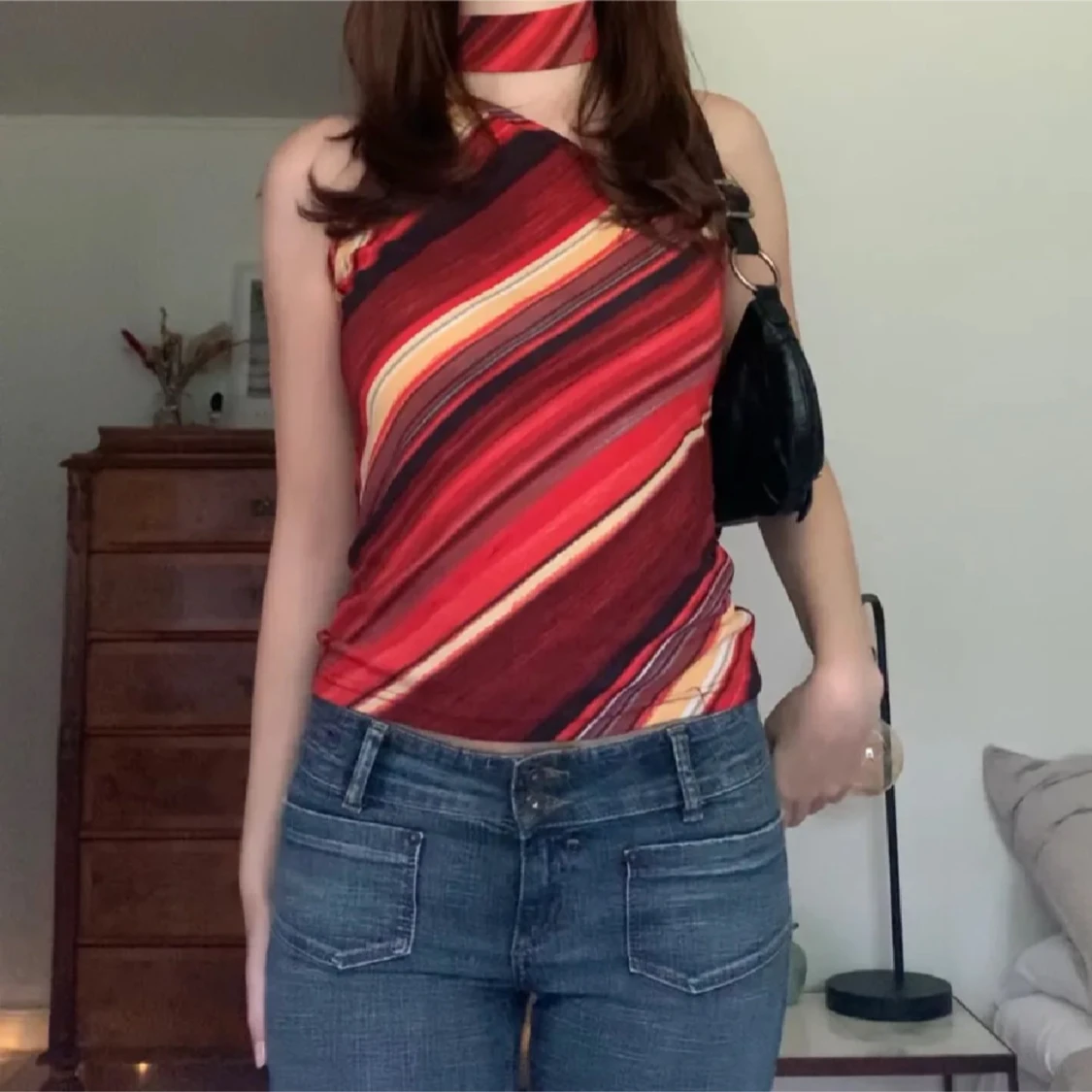 Randig oneshoulder topp i rött och orange
