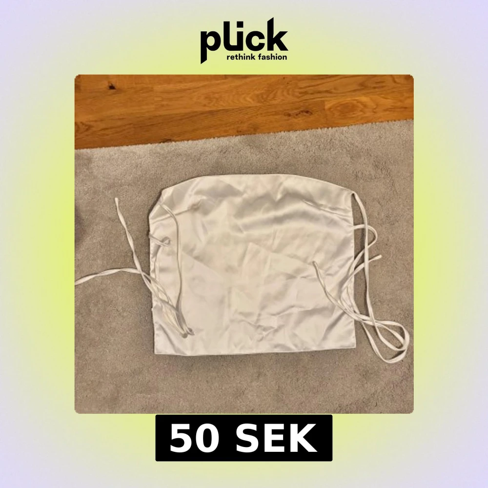 Säljer en vit bandeau tubtopp i satin med snörning i sidorna och helt öppen rygg. Toppen är axelbandslös och har en slät, glansig yta som ger en lyxig känsla. Perfekt för dig som vill ha en enkel men snygg topp till din outfit.