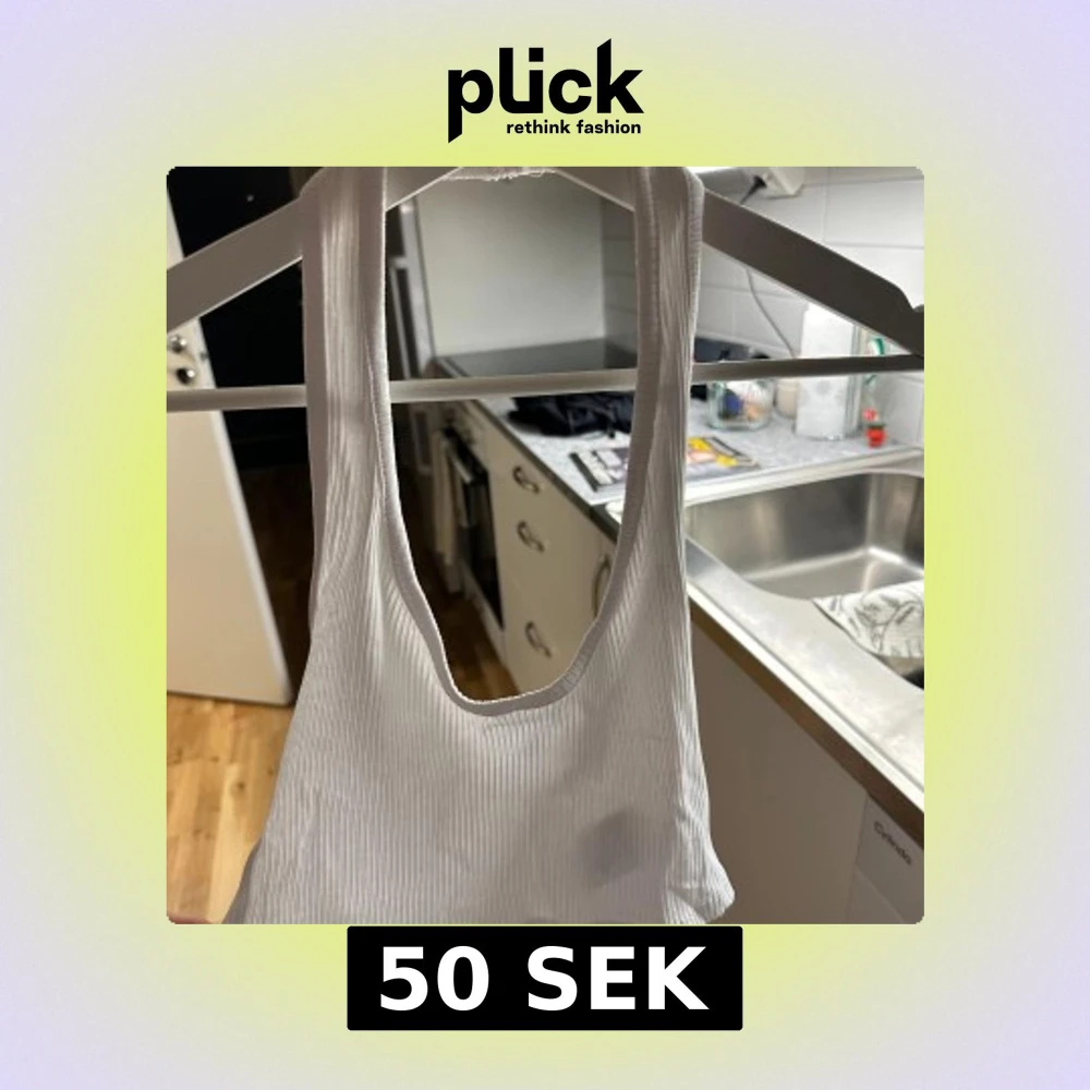 Säljer en stilren vit ribbad linnetopp med djup urringning. Perfekt för varma dagar eller som lager under en jacka. Enkel och mångsidig design.