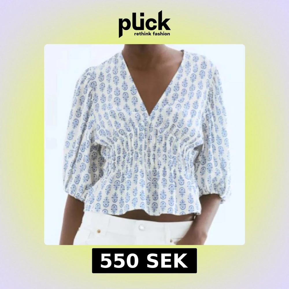 đLAPP FORTFARANDE PĂ đSupersöt blus i vit med blĂ„tt blommönster, croppad passform och v-ringad hals. Blusen har puffiga trekvartsĂ€rmar och snygg rynkning i midjan som ger en cool siluett. Perfekt för dig som gillar romantiska detaljer och frĂ€sch stil. Helt ny