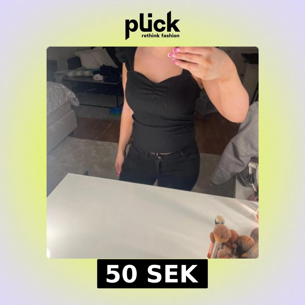 Svart ribbad topp från Shein i storlek S. Toppen har breda axelband med volangdetaljer och en snygg v-ringning. Figurnära passform och croppad längd, perfekt att styla med höga jeans eller kjol. Enkel men ändå trendig look.