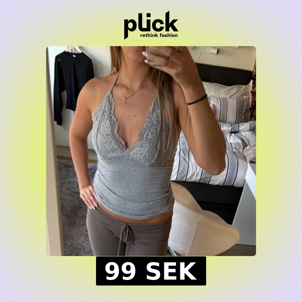 Säljer en ljusgrå linnetopp med smala axelband och djup v-ringning. Toppen har vackra spetsdetaljer med blommönster över bysten och en mjuk, stretchig passform.