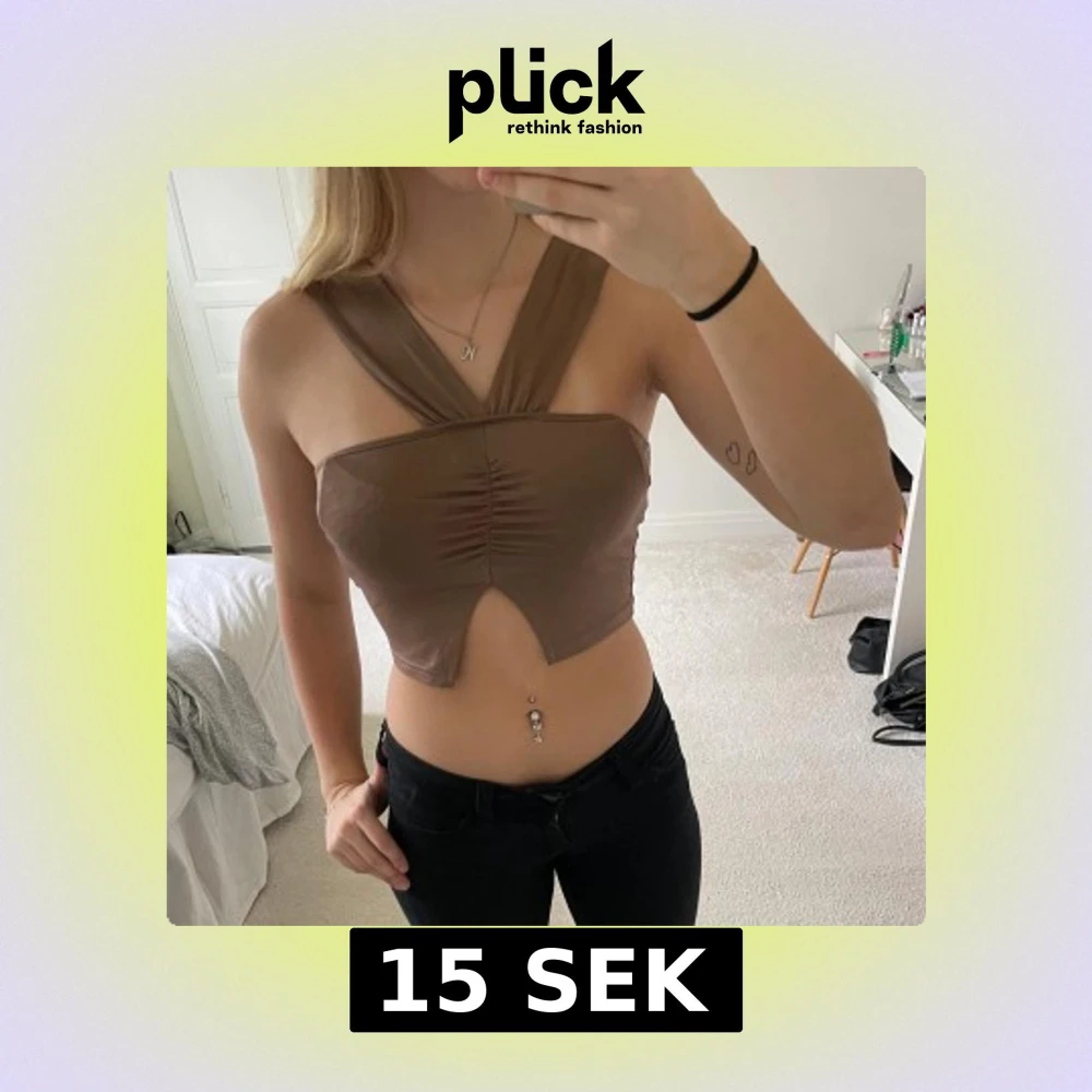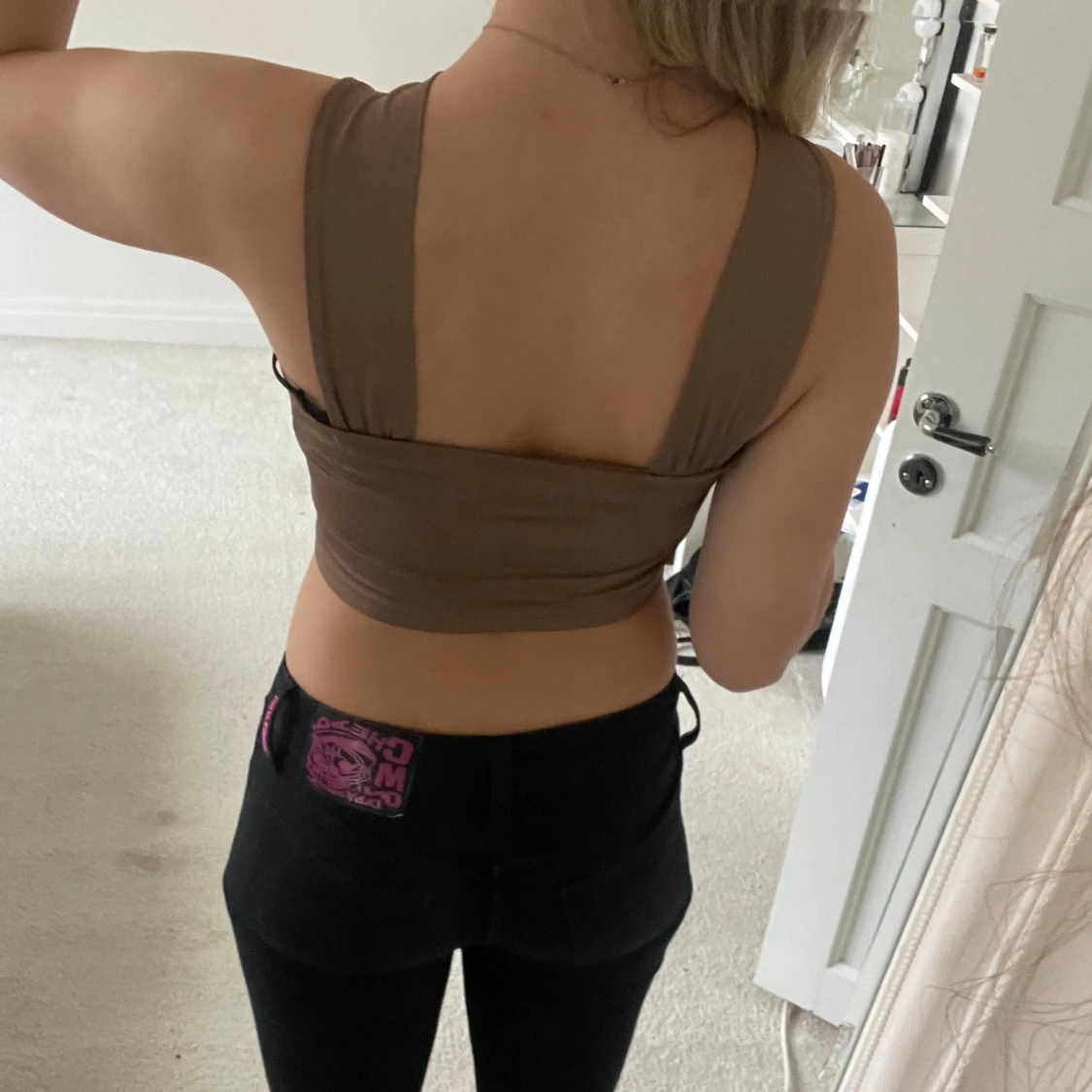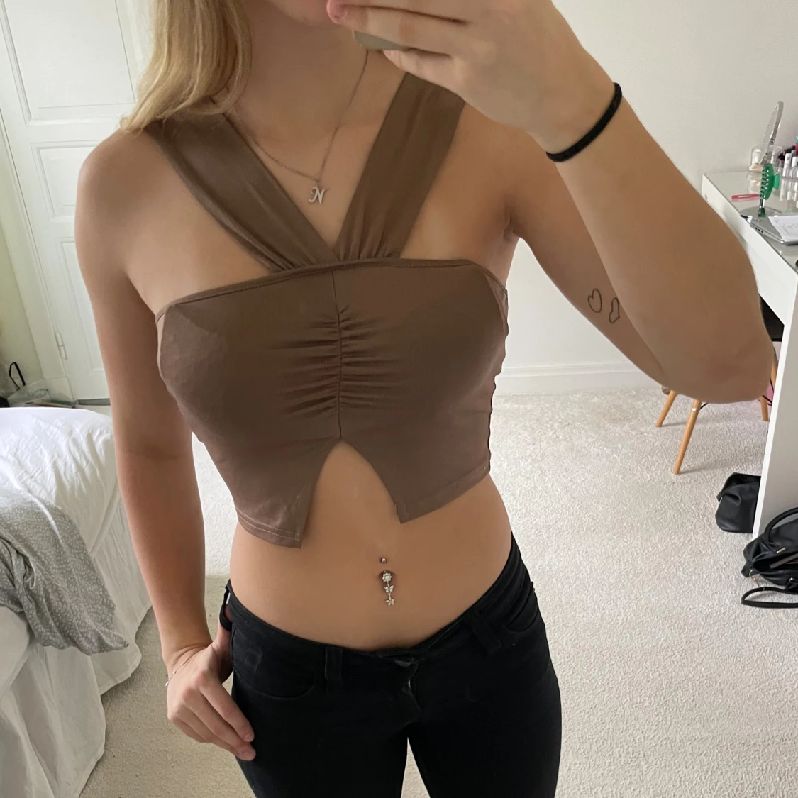 Säljer en brun croppad linnetopp med breda axelband som korsas framtill. Toppen har en snygg twist-detalj vid halsen och en liten slits framtill. Mjuk och stretchig i materialet, perfekt till jeans eller kjol.