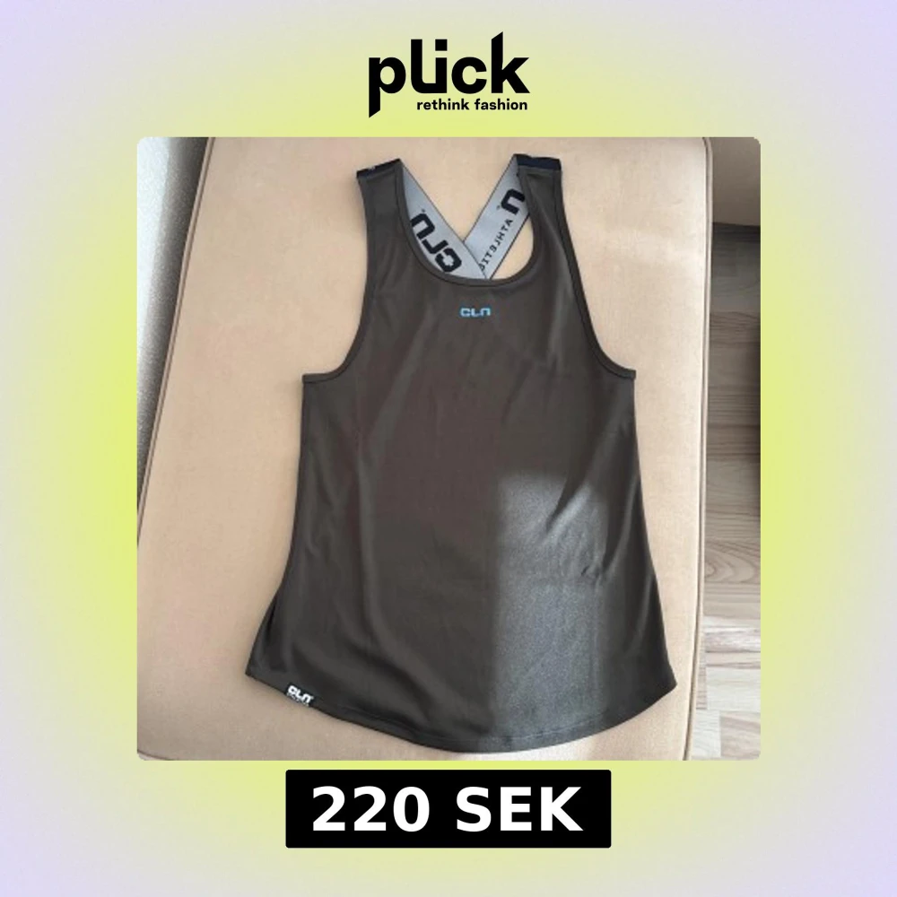 Säljer en brun linnetopp från CLN Athletics med breda axelband och logga på ryggen. Perfekt för träning med sin bekväma passform och stilrena design.
