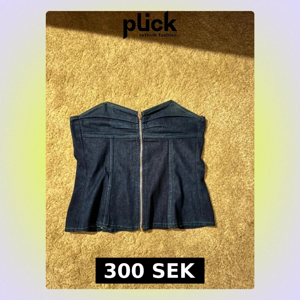Säljer en snygg mörkblå korsett-topp i denim med markerad midja och dragkedja framtill. Toppen är axelbandslös och har en cool, strukturerad form. Ända defekten är sömm som gått upp lite, men stör inte användningen.