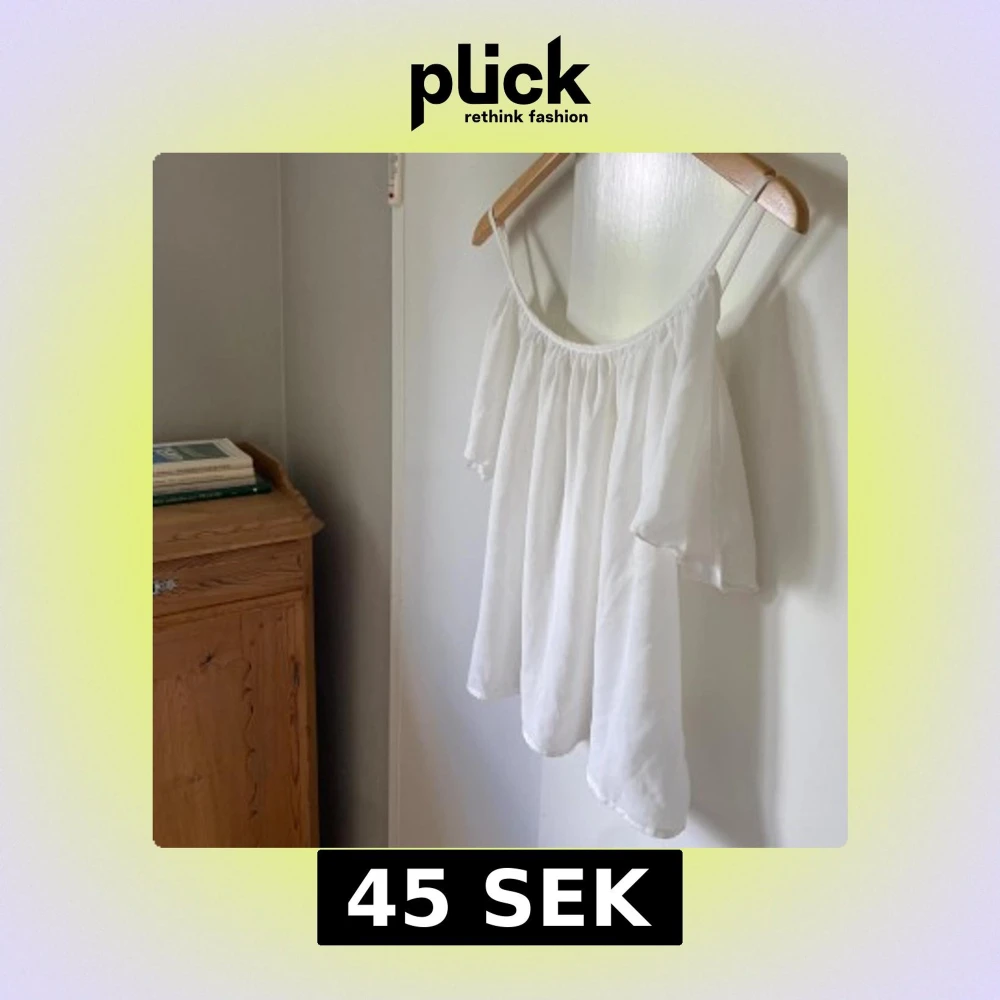 Superfin vit offshoulder blus med tunna axelband och vida, luftiga ärmar. Tyget är lätt och har en snygg fallande effekt. Perfekt för en fräsch och stilren look. Passar dig som gillar en luftig och avslappnad vibe. Var tvungen att klippa av lappen då den kliade. Storlek S/M