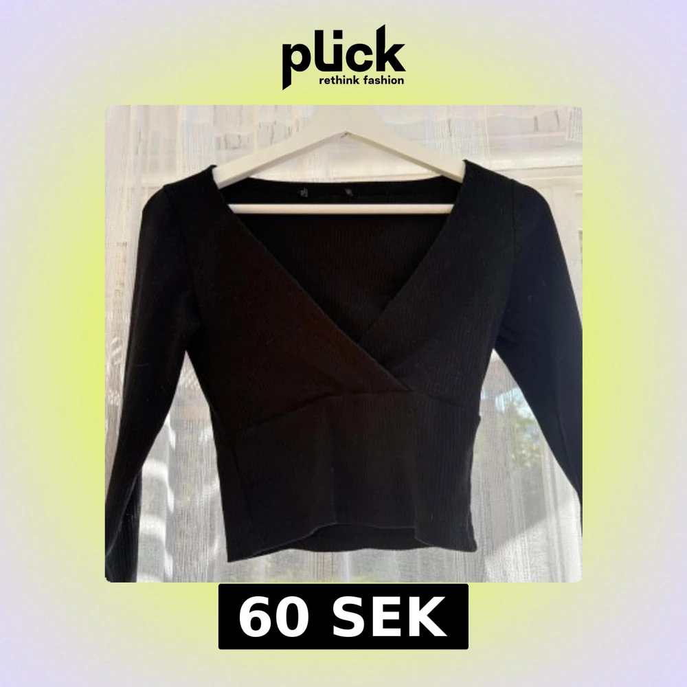 Säljer en svart omlottopp med v-ringning och långa ärmar. Toppen är ribbad och har en croppad passform som ger en snygg siluett. Perfekt att styla med höga jeans eller kjol för en trendig look.