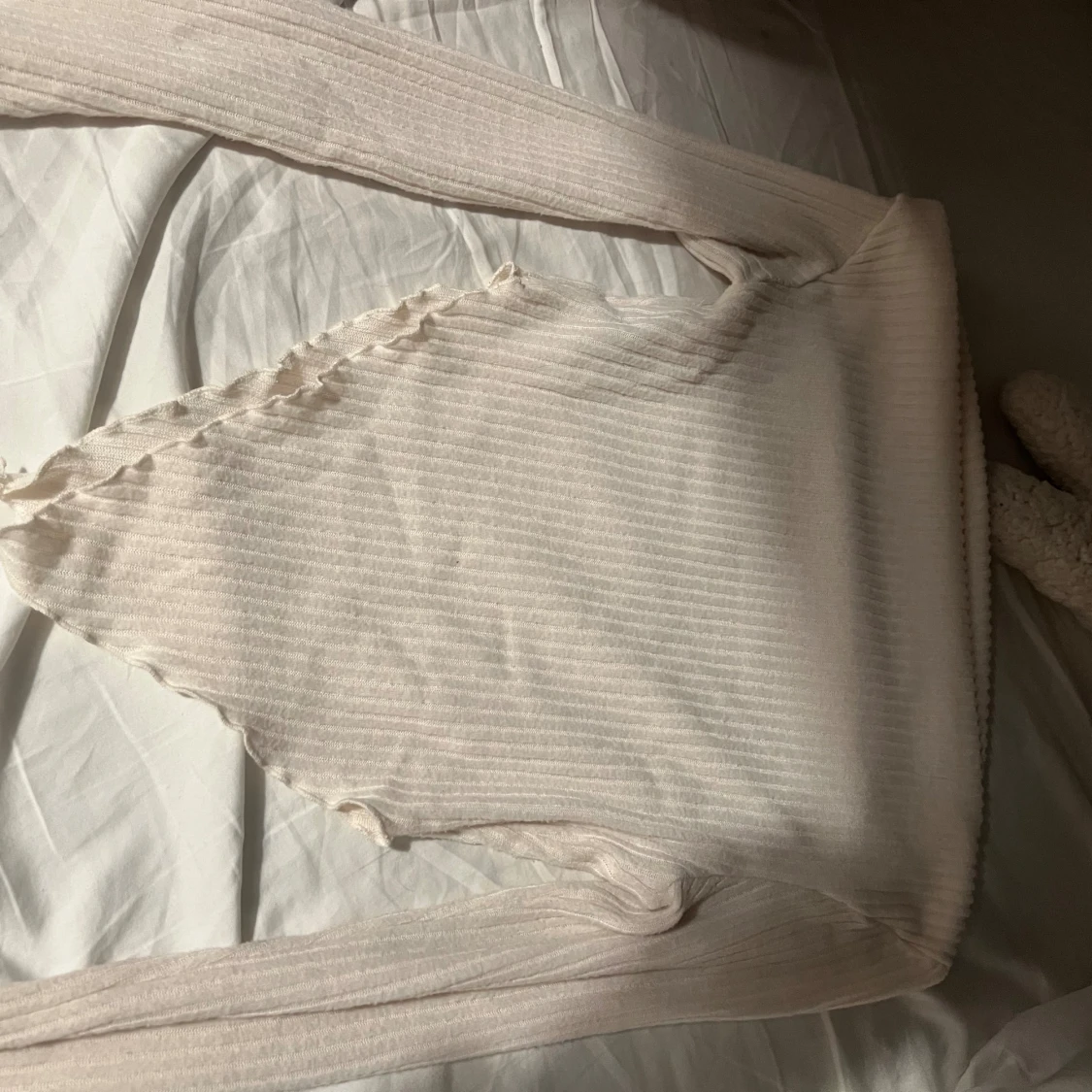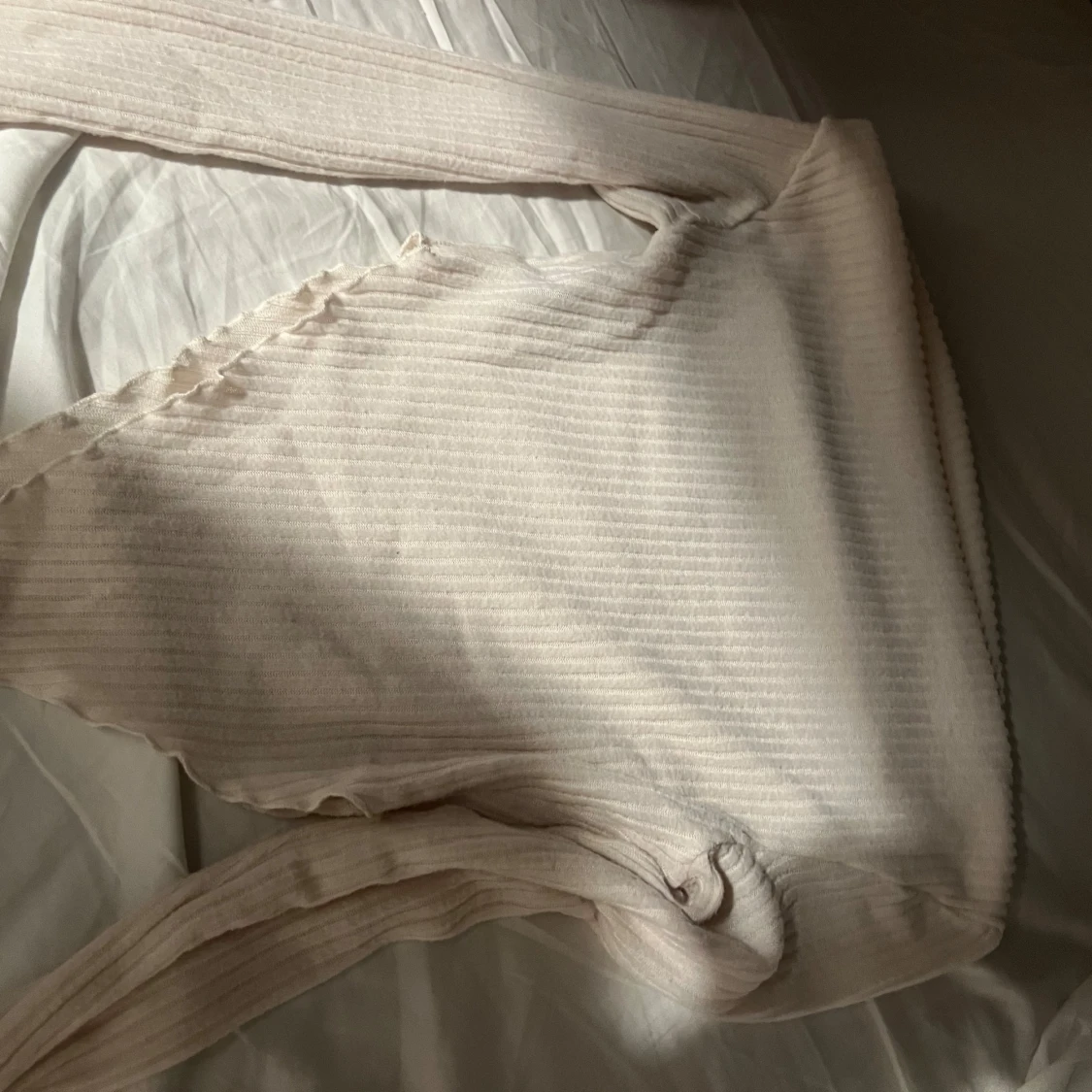 Supersnygg ljusbeige omlottopp med långa ärmar och ribbad struktur. Toppen har en unik omlott-design med spetsiga kanter och är tillverkad i ett mjukt, stretchigt material som sitter skönt på kroppen. Perfekt för dig som gillar trendiga och stilrena plagg.