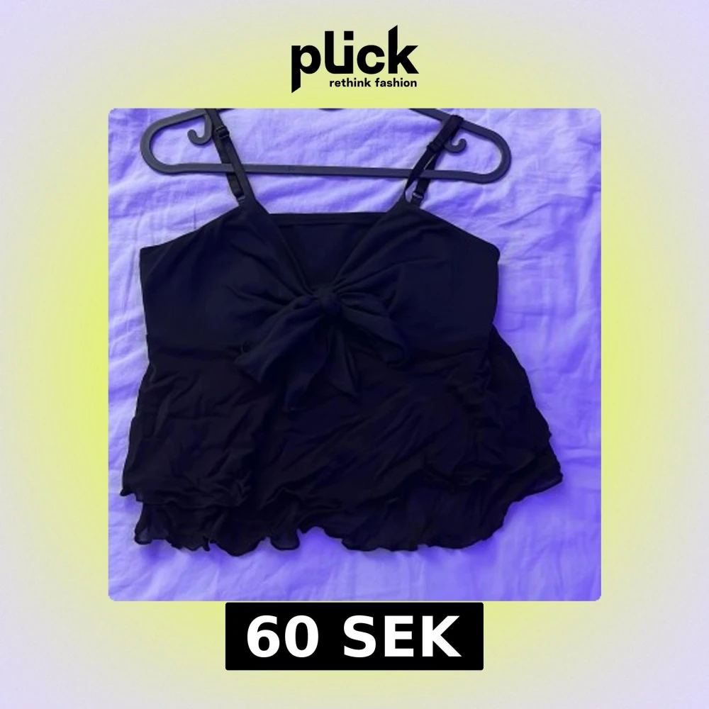 Supersöt svart linnetopp med volanger och stor rosett framtill. Toppen har smala axelband och är tillverkad i ett lätt, flowy material som ger en luftig känsla.