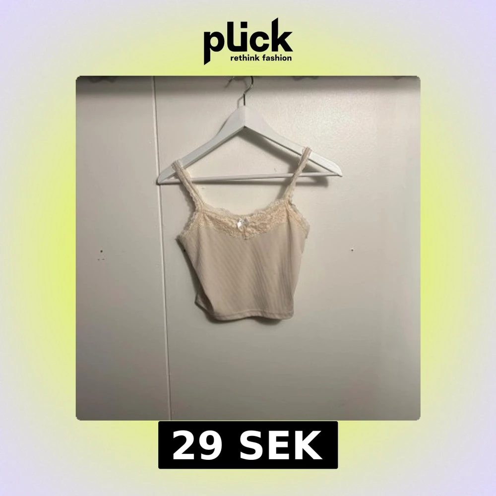 Supersöt beige linnetopp från Romwe i ribbad polyester med spetskant och liten rosett framtill. Axelbandsmodell och croppad passform, perfekt för lager på lager eller sommaroutfits. Storlek S (EU 36).