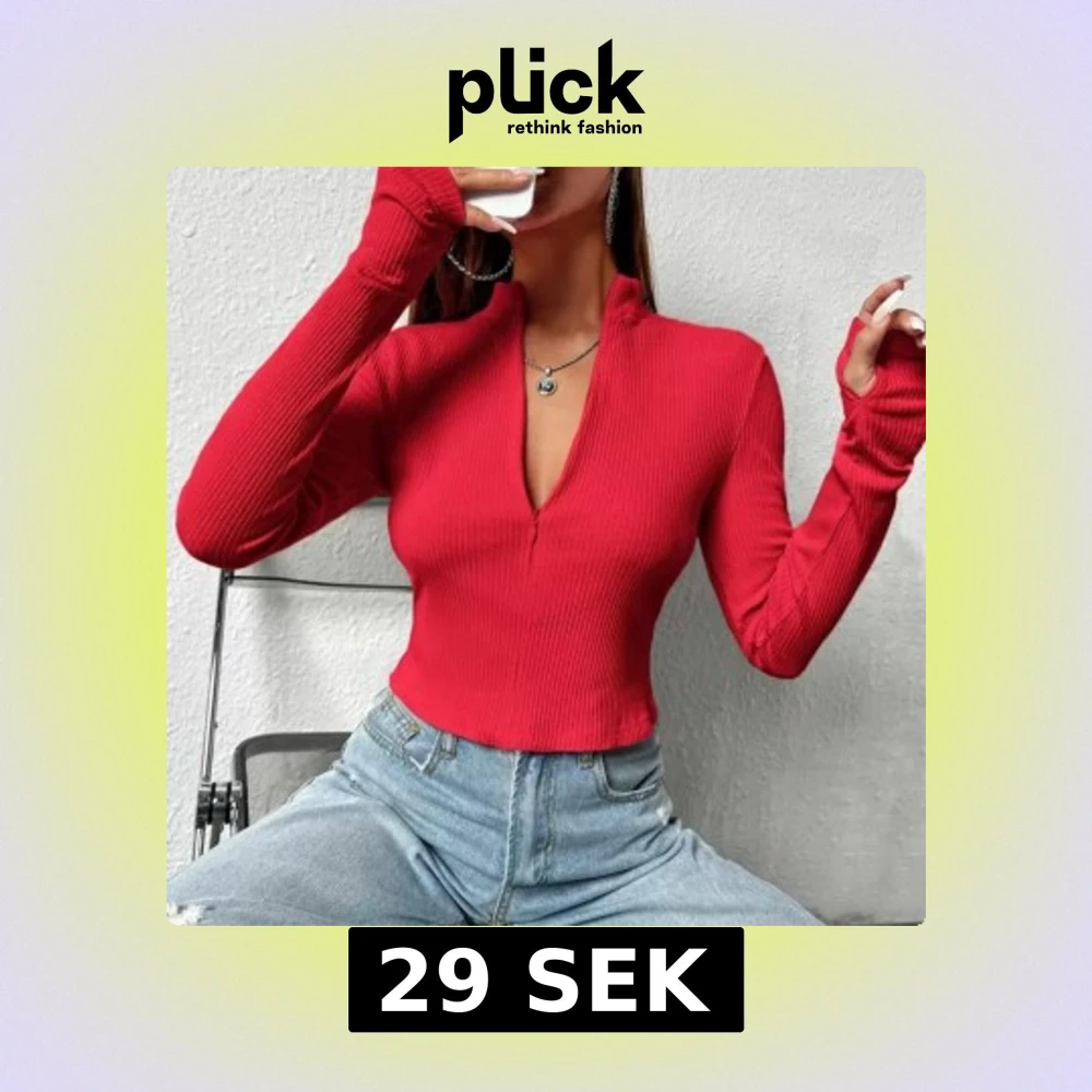 Snygg röd croppad topp med lång ärm och ribbad struktur. Djup v-ringning med dragkedja framtill ger en trendig look. Perfekt att matcha med höga jeans för en cool vardagsstil.
