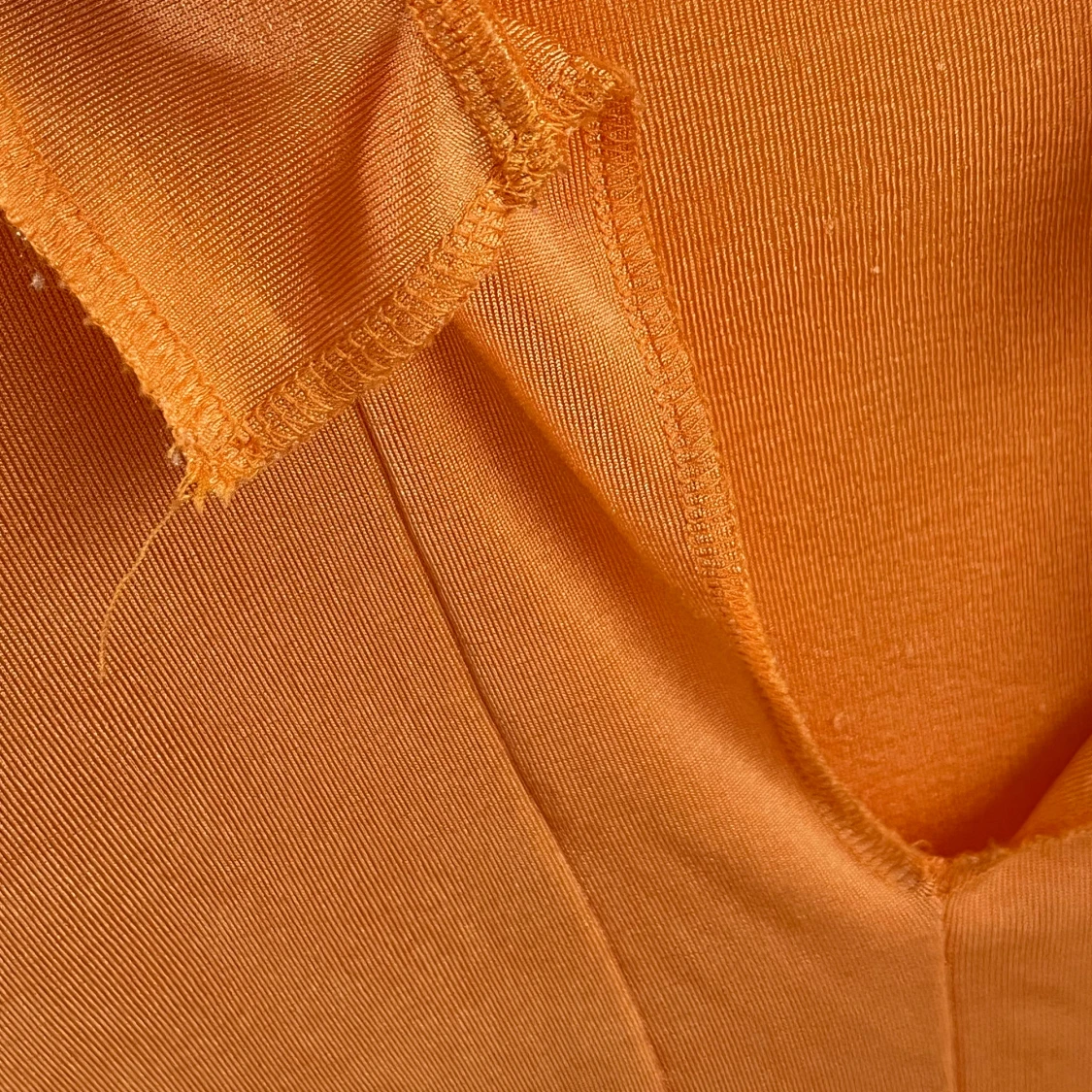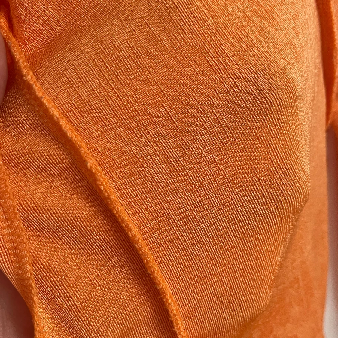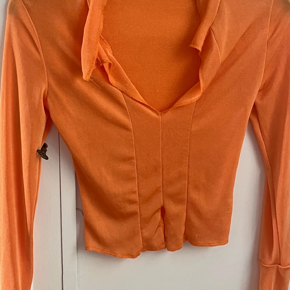 Säljer en snygg orange långärmad topp i ett mjukt och stretchigt material. Toppen har en v-ringad design och en stilren look som passar perfekt till både vardag och fest. Den är i bra skick och redo för en ny ägare!