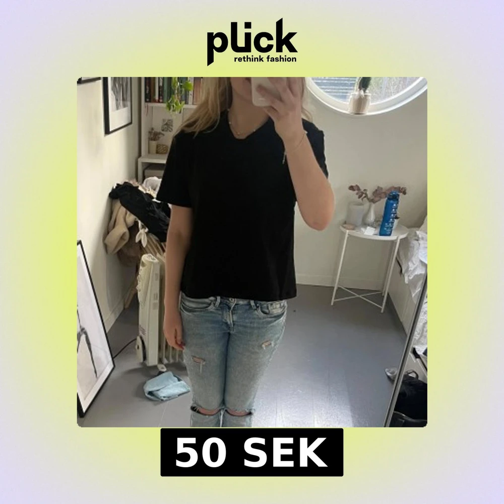 Snygg svart t-shirt med korta ärmar och spetsdetaljer på baksidan. Perfekt för en stilren look med en twist. Storlek S💗