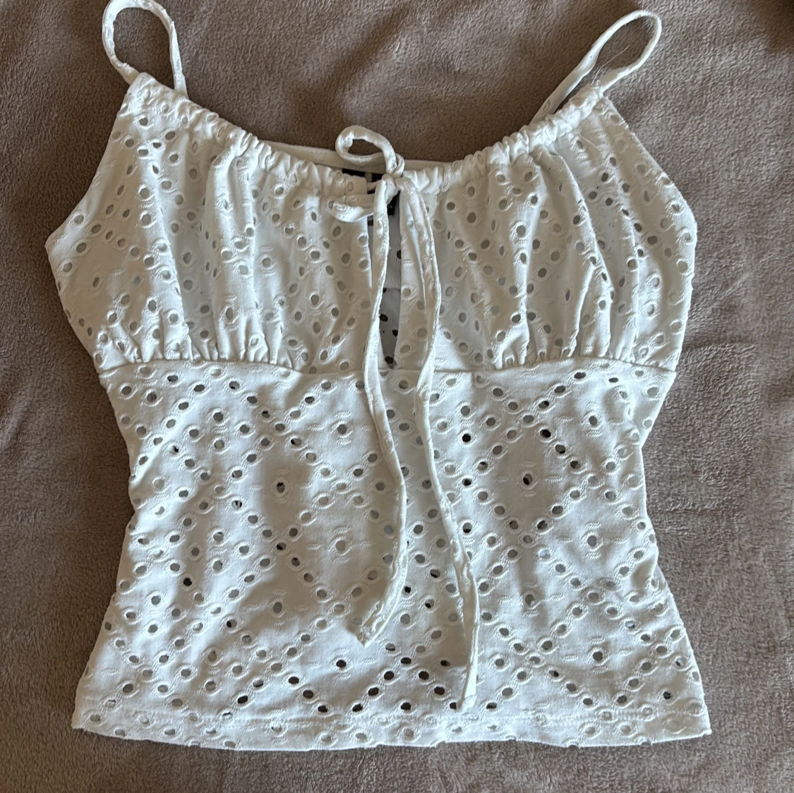 Supersöt vit linnetopp med hålmönster och smala axelband. Toppen har knyt fram och en lätt rynkad överdel som ger en romantisk vibe. Perfekt för varma dagar och enkel att styla med jeans eller kjol.💗