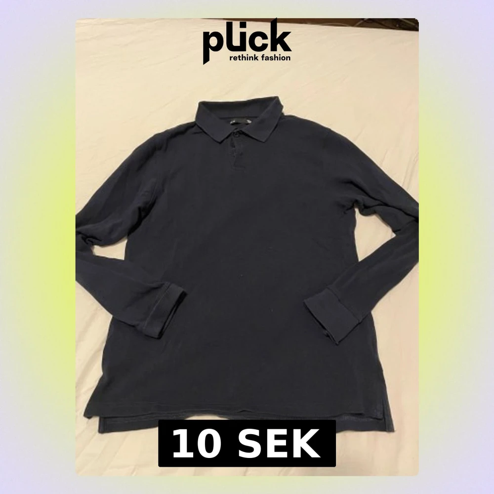 Säljer en stilren mörkblå långärmad polotopp från 15:e i storlek S. Toppen har klassisk krage och knäppning med tre knappar framtill. Materialet är mjukt och känns som bomull, perfekt för dig som gillar enkel och clean stil.