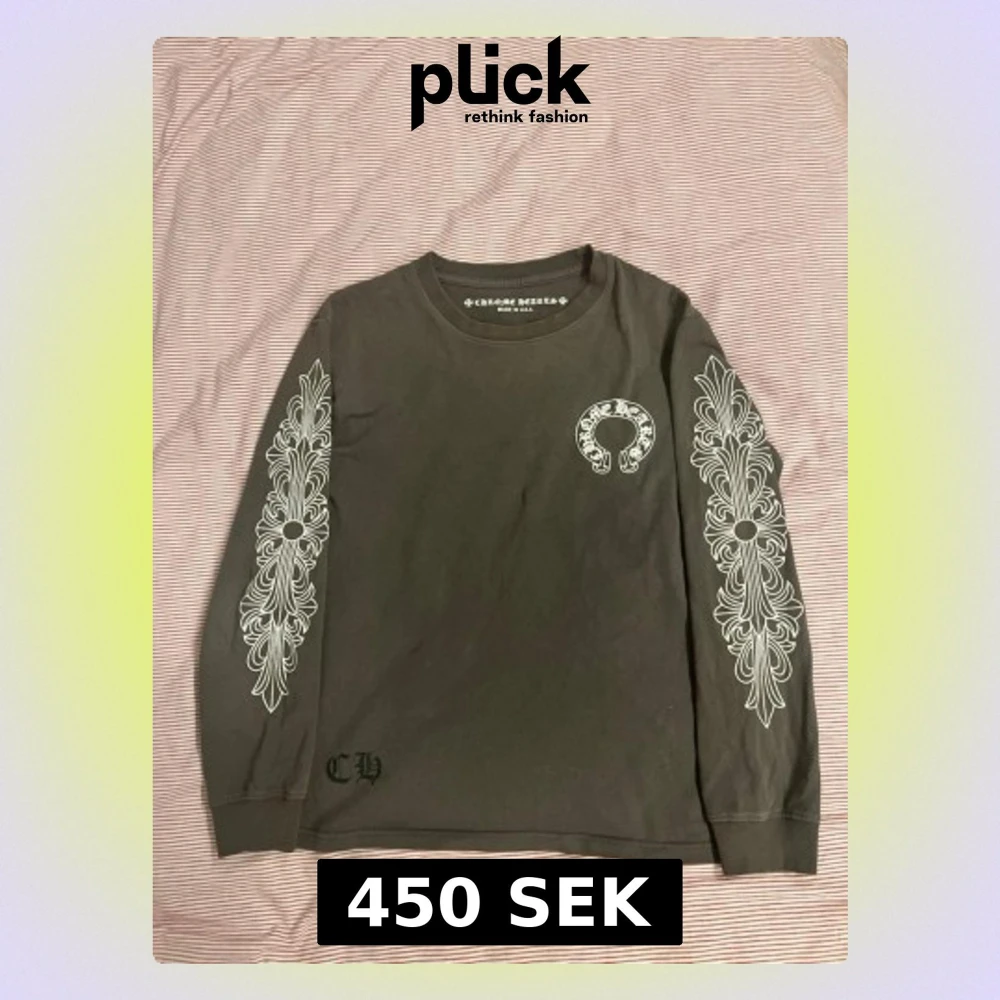 Säljer en grå långärmad topp från Chrome Hearts med vita grafiska tryck längs båda ärmarna och logga på bröstet samt ryggen. Tröjan har rund halsringning och är tillverkad i mjuk bomull. Perfekt för dig som gillar streetwear och unika detaljer.