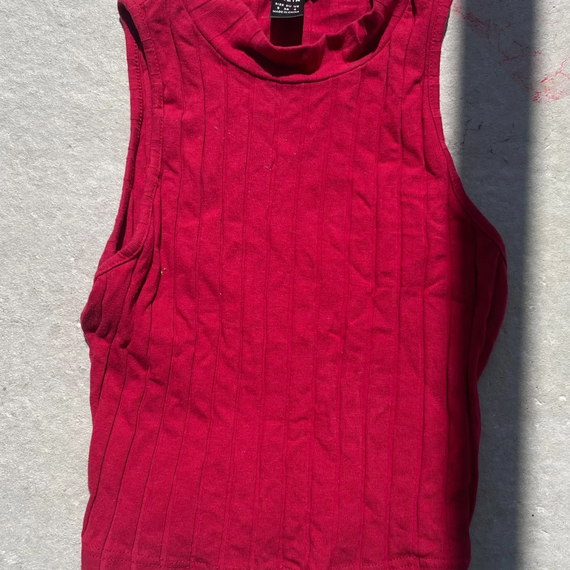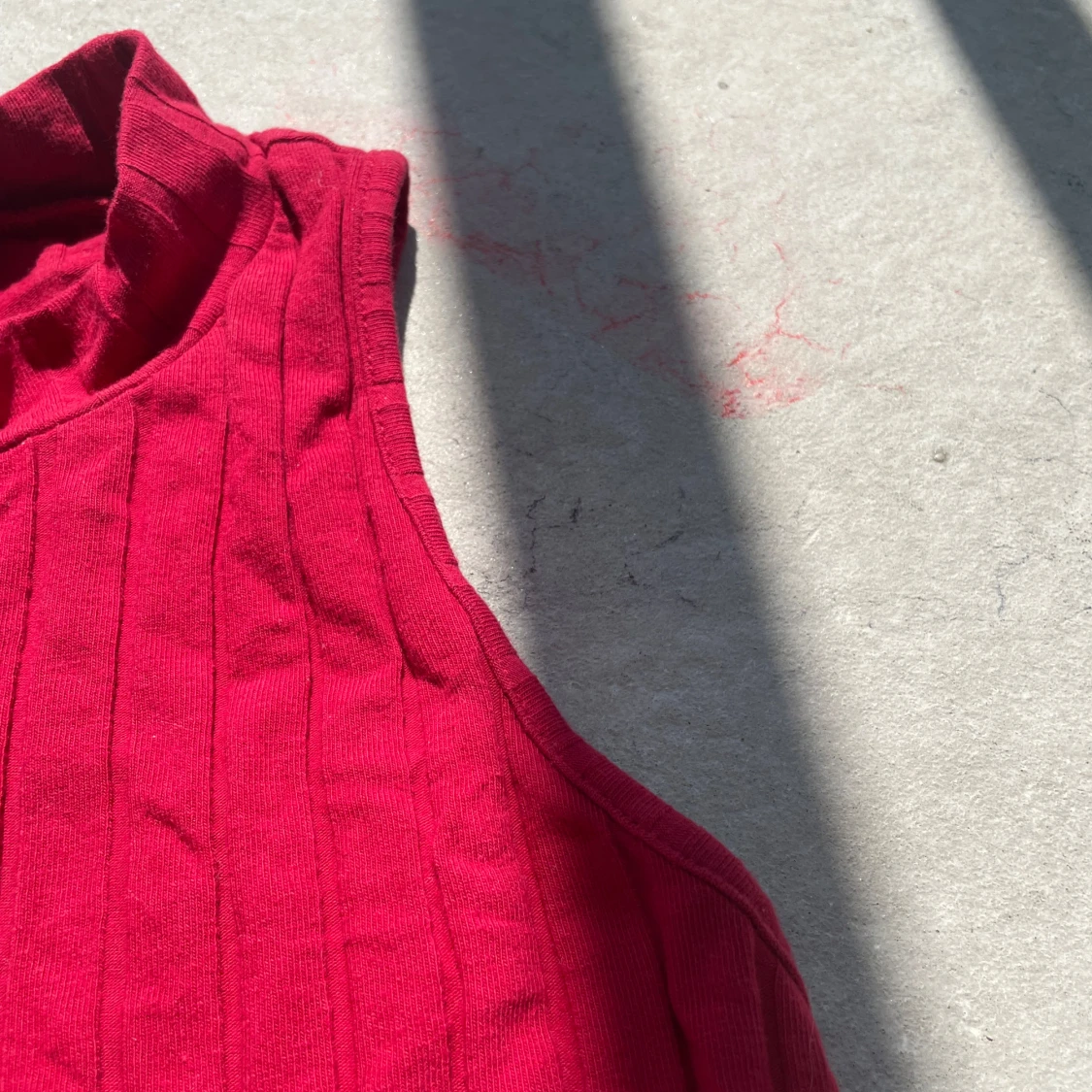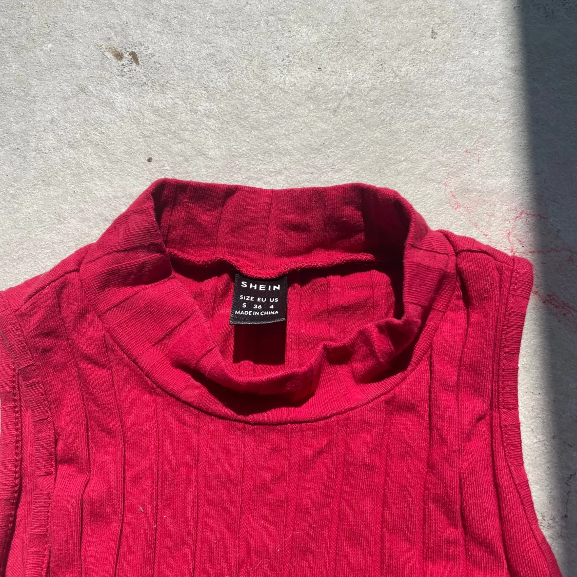 Snygg ribbad polotopp från SHEIN i en djup röd färg. Toppen är ärmlös med hög krage och har en tight passform. Perfekt att styla med jeans eller kjol för en trendig look.