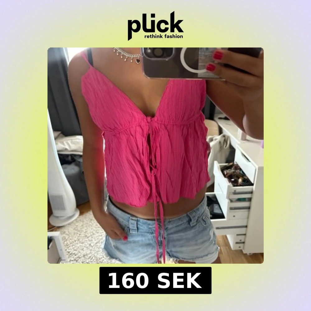 Supersöt rosa linnetopp med smala axelband och djup v-ringning. Toppen har en luftig, vågig struktur och knytband framtill som ger en avslappnad och trendig look. Perfekt för varma dagar och enkel att styla med jeansshorts eller kjol.