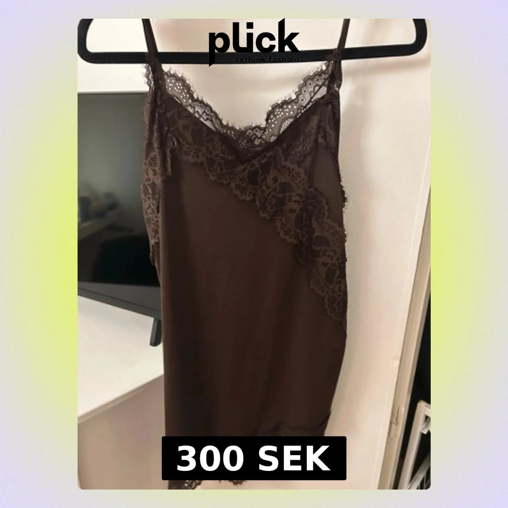 Säljer en brun linnetopp med tunna axelband och vackra spetsdetaljer längs urringningen och nederkanten. Toppen har en mjuk, följsam känsla och en feminin v-ringad form. Perfekt att styla lager på lager eller som den är.