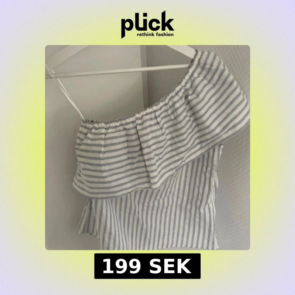 Säljer en vit och blå randig offshoulder topp med volangdetalj. Snygg att matcha med jeans eller kjol, går att klä upp och ner❤️