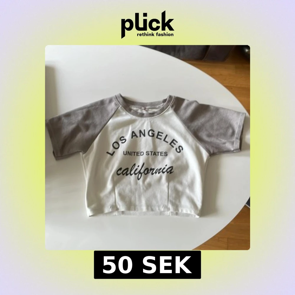 Snygg croppad t-shirt med grå ärmar och vit kropp. Tryck framtill med texten 'Los Angeles United States California' i svart. Klassisk rund halsringning och avslappnad passform. Perfekt för en chill och trendig look.