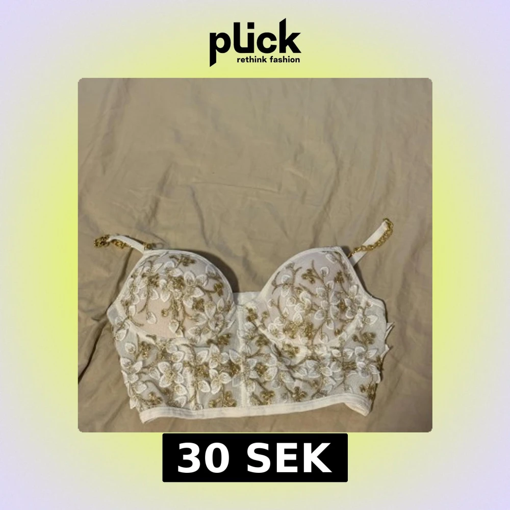 Superfin vit bralette med broderade blommor i guld och vita toner. Axelbanden är delvis i guldfärgad kedja och delvis justerbara band. Kuporna är vadderade och toppen har hakknäppning i ryggen. Från SHEIN och i storlek i S, har använt den endast en gång.