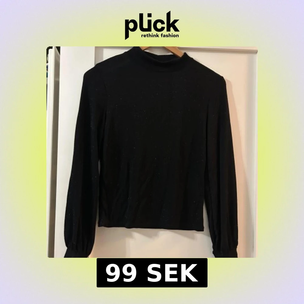 Snygg svart polotopp med diskret glittrigt tyg och långa ärmar. Toppens höga krage ger en stilren look och materialet är mjukt och följsamt. Perfekt för dig som vill ha något enkelt men ändå med lite extra shine.