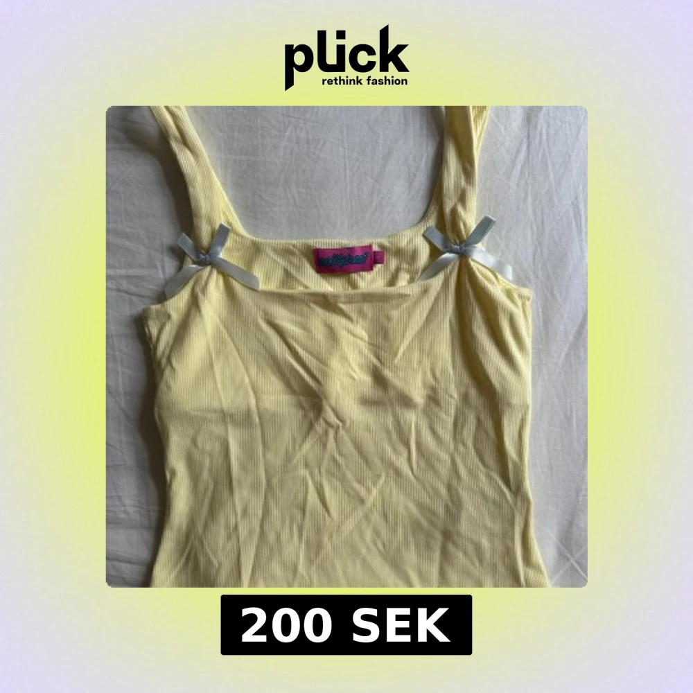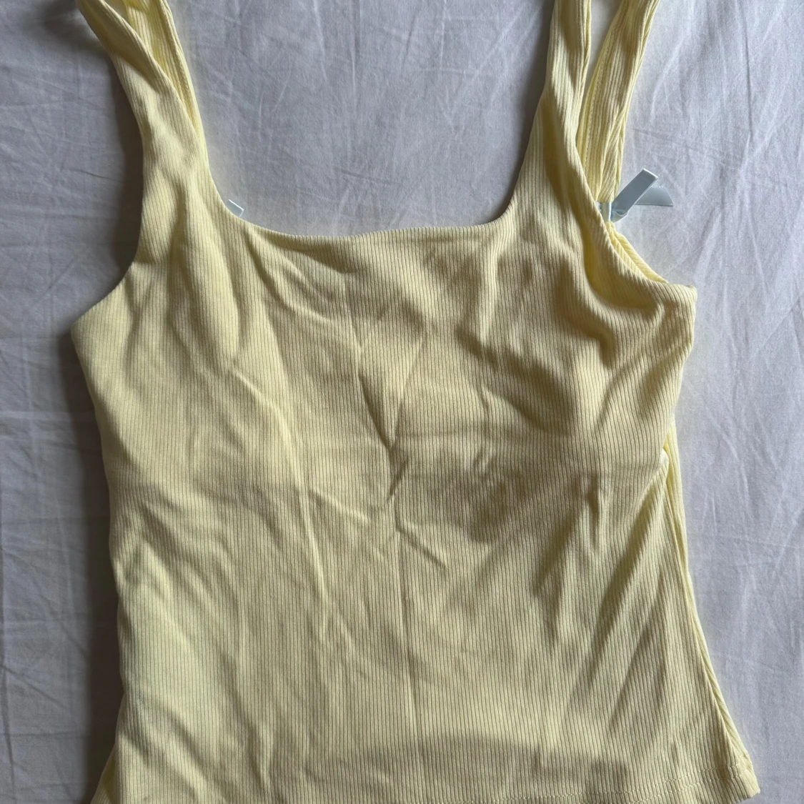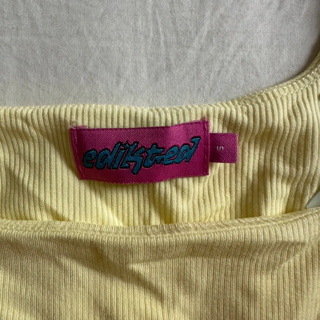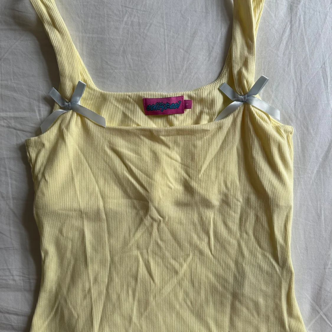 Supersöt ljusgul ribbad linnetopp från Edikted med breda axelband och små silvriga rosetter vid axlarna. Toppen har en tight passform och är perfekt för varma dagar. Materialet är mjukt och stretchigt för extra komfort. Aldrig använt