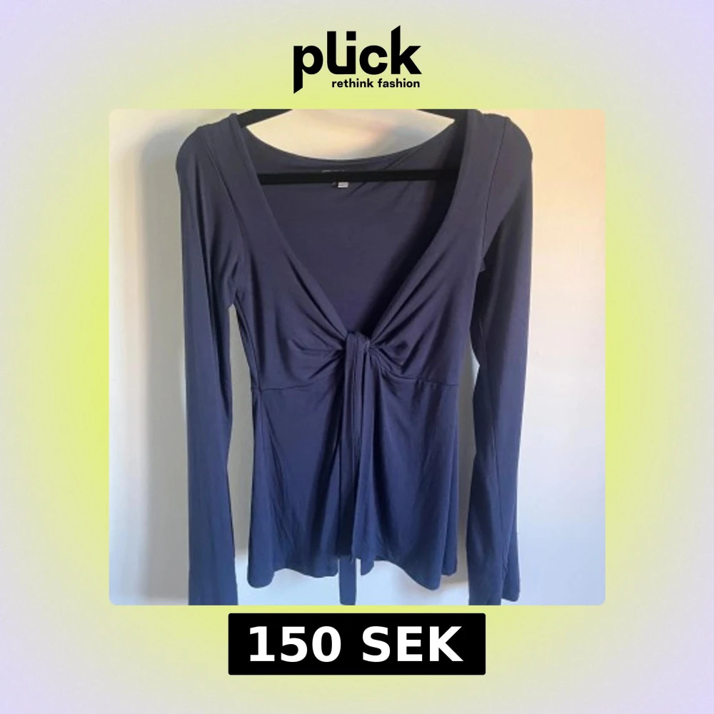 Snygg mörkblå långärmad topp med djup v-ringning och knyt framtill. Toppens material är mjukt och stretchigt, vilket gör den bekväm att bära. Perfekt för dig som gillar en enkel men trendig look.
