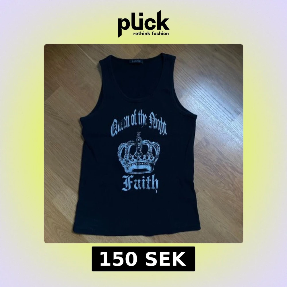 Svart ribbad linnetopp från b.young med silverfärgat tryck som visar en krona och texten 'Queen of the Night Faith' i gotisk stil. Modellen är ärmlös och har rundad hals. Perfekt för dig som gillar edgy och statement-plagg.