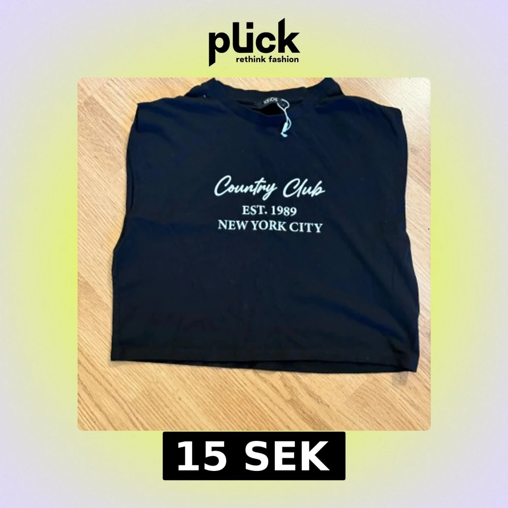 Svart croppad linnetopp från XSIDE med vit text 'Country Club EST. 1989 NEW YORK CITY' framtill. Toppen är ärmlös och har en enkel, rak passform. Perfekt för en chill och avslappnad stil.