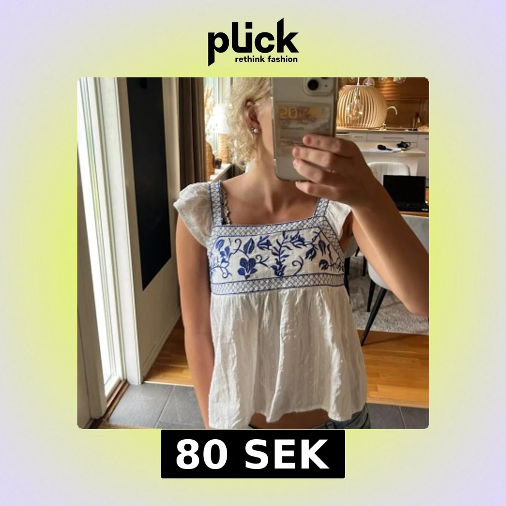 Supersöt vit blus med blå broderade blommor och rutmönster upptill. Puffiga ärmar, fyrkantig ringning och knytband i ryggen. Tunt bomullstyg med diskreta prickar och struktur. Inte stretchig! Aldrig använd