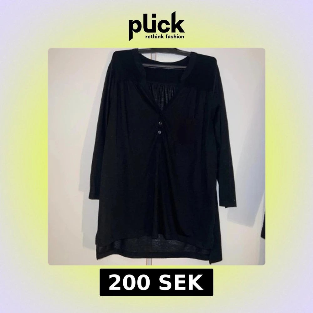 Svart långärmad blus från i 100% viskos. Modellen är loose fit med v-ringning, tre knappar framtill och en liten bröstficka. Blusen har en något längre och rundad nederkant baktill och är perfekt för en chill och stilren look. skulle gissa att det är en storlek s etiketten finns inte kvar