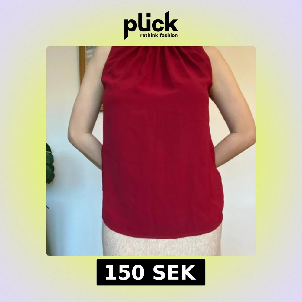 Snygg röd blus med hög hals och fina rynkdetaljer framtill. Toppen är ärmlös och har ett svart sammetsband som knyts i nacken, vilket ger en elegant touch. Passformen är loose och materialet känns mjukt och följsamt.