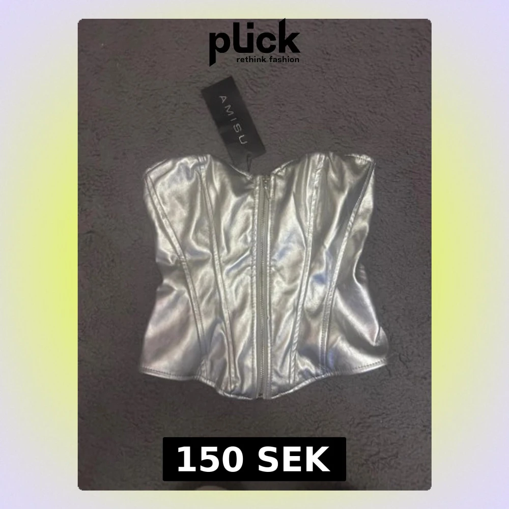 Säljer en snygg silverfärgad korsett med dragkedja framtill. Toppen är axelbandslös och har en glansig metallic yta. Perfekt för dig som vill ha en statement piece i garderoben. Helt ny, säljer för 150kr