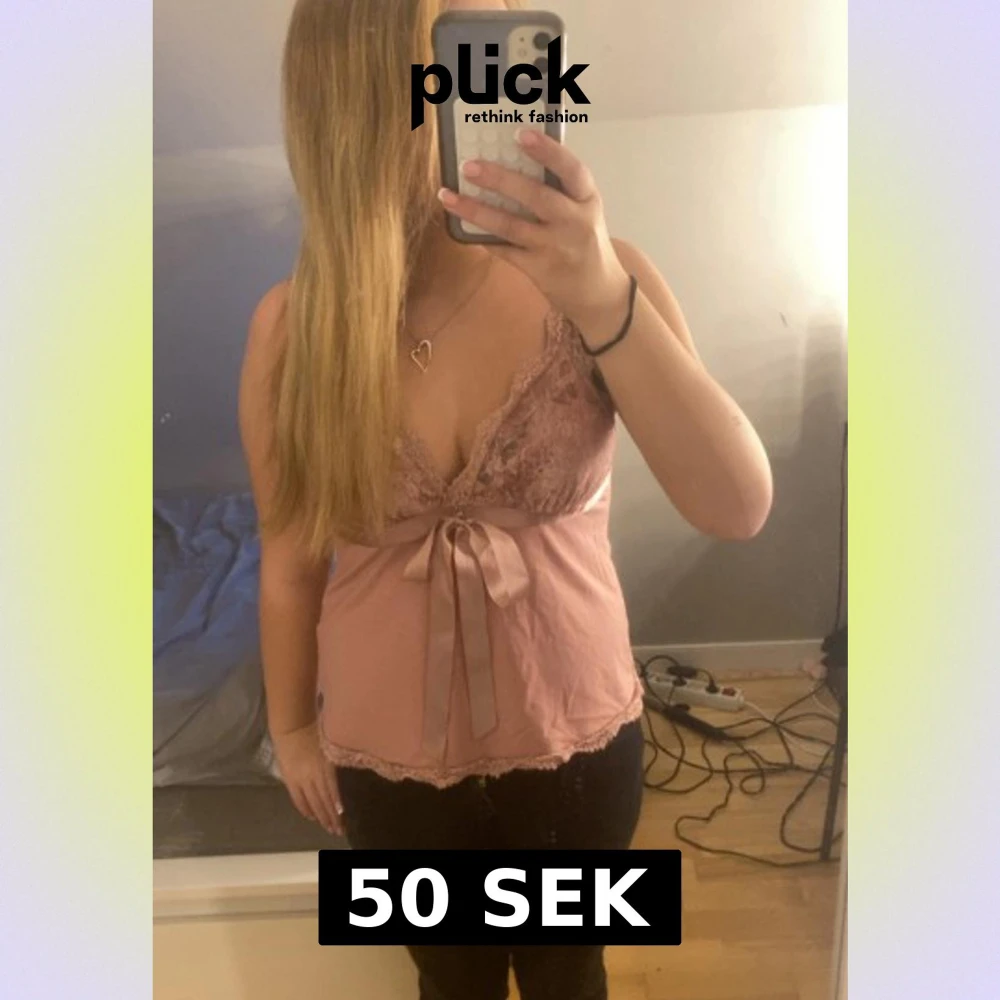 Säljer en ljusrosa linnetopp med spetsdetaljer och v-ringad hals. Toppen har en söt rosett framtill och spetskant längs nederkanten. Axelbandslös design med omlott-effekt över bysten. Perfekt för dig som gillar romantisk och feminin stil.