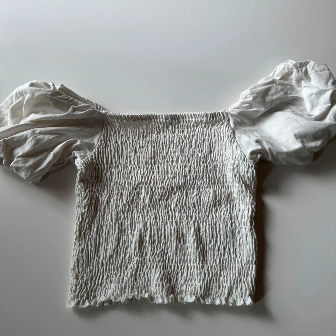 Supersöt vit topp med smockad kropp och stora puffiga kortärmar. Offshoulder-modell som ger en trendig och romantisk vibe. Perfekt att styla med jeans eller kjol för en cool look.