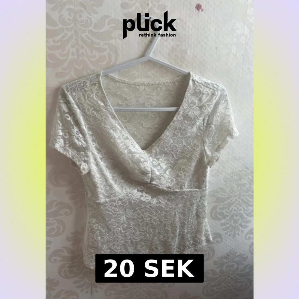 Säljer en vit blus i spets med v-ringad hals och korta ärmar. Blusen har ett blommigt spetsmönster och är lätt transparent. Passformen är normal och materialet känns mjukt och luftigt, perfekt för dig som gillar romantiska detaljer.