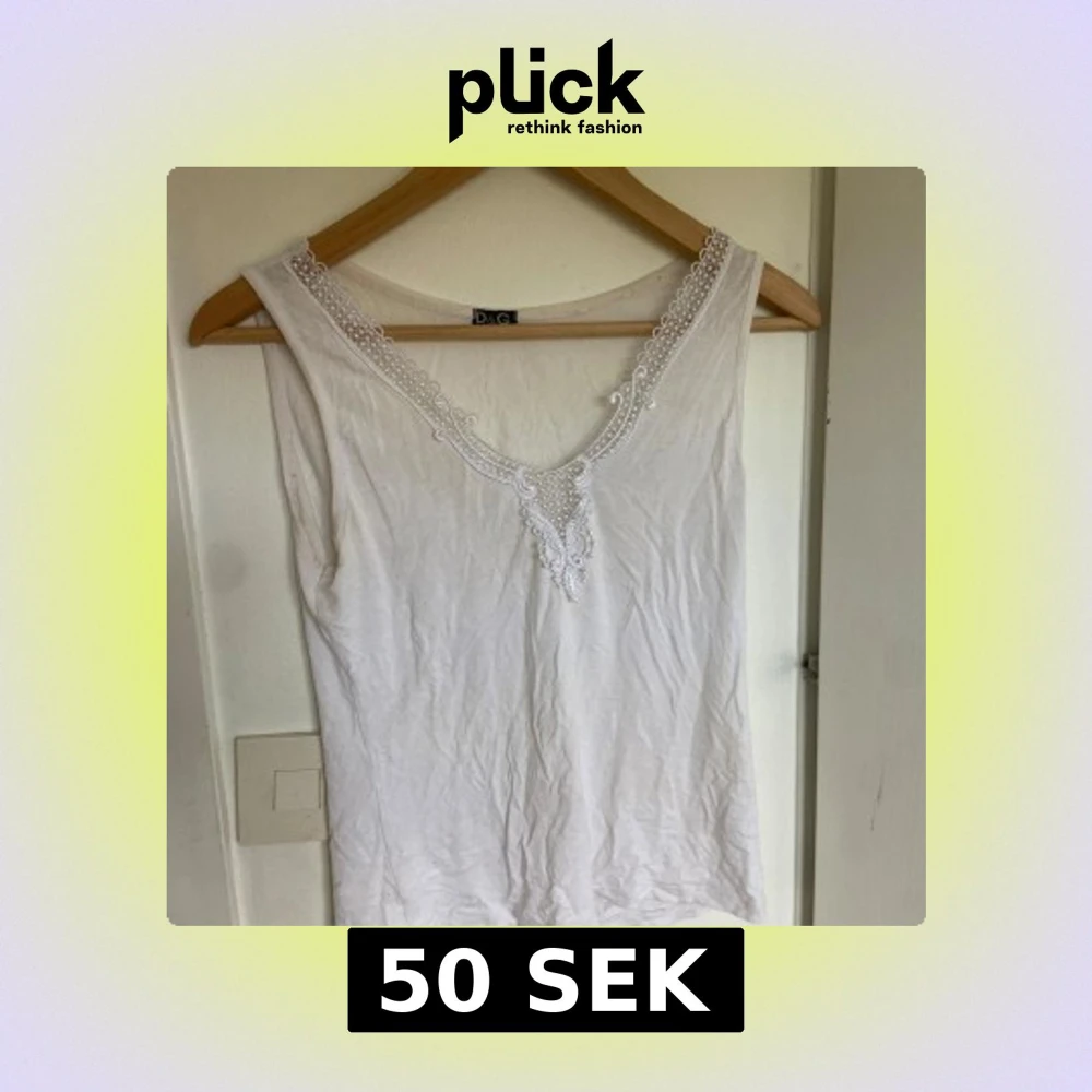 Säljer en vit linnetopp från Dolce & Gabbana med v-ringning och fina spetsdetaljer längs halsringningen. Toppen är ärmlös och tillverkad i mjuk bomull, perfekt för varma dagar.