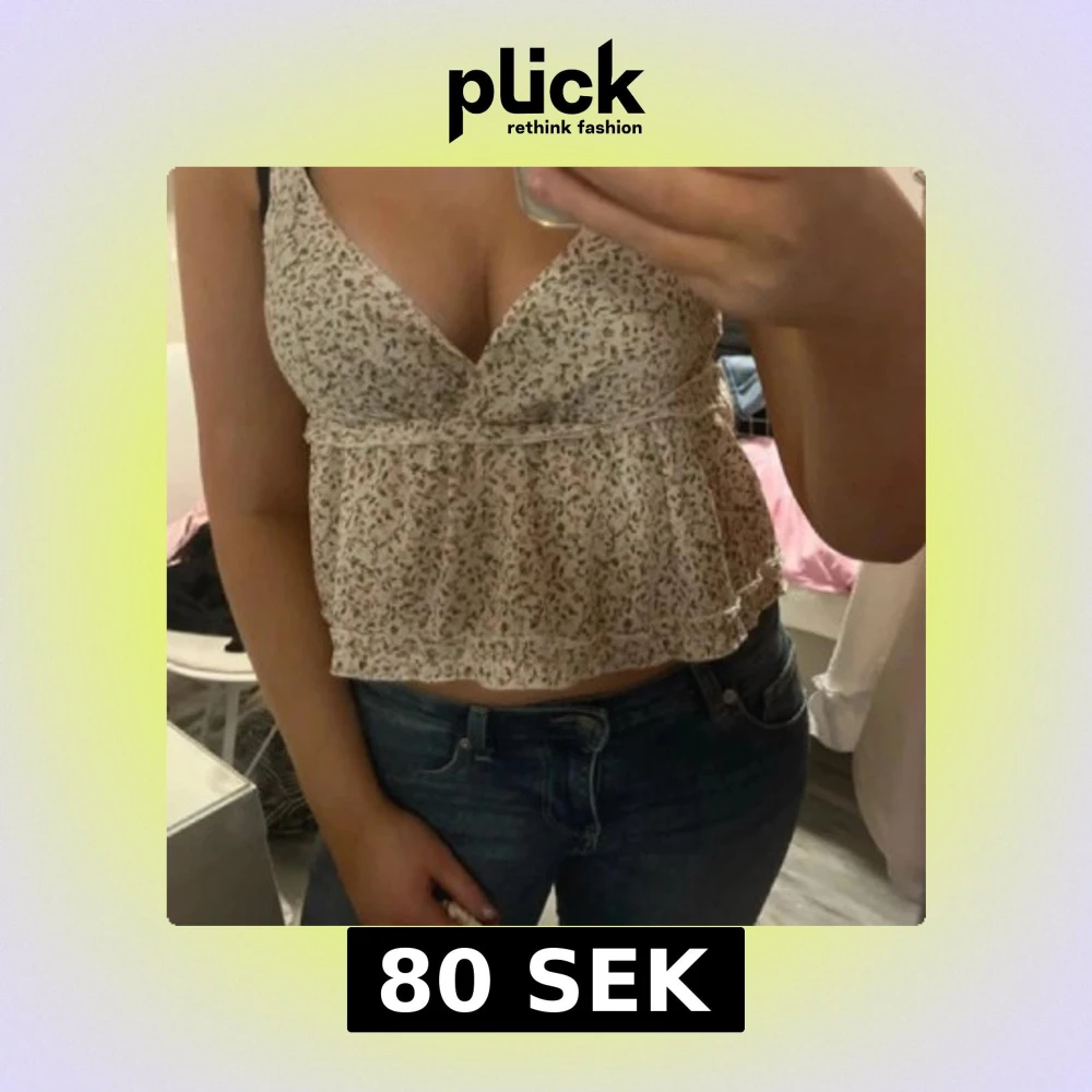Söt croppad linnetopp i beige med småblommigt mönster och v-ringad hals. Toppen har en lätt volang nertill och är ärmlös, perfekt för varma dagar.
