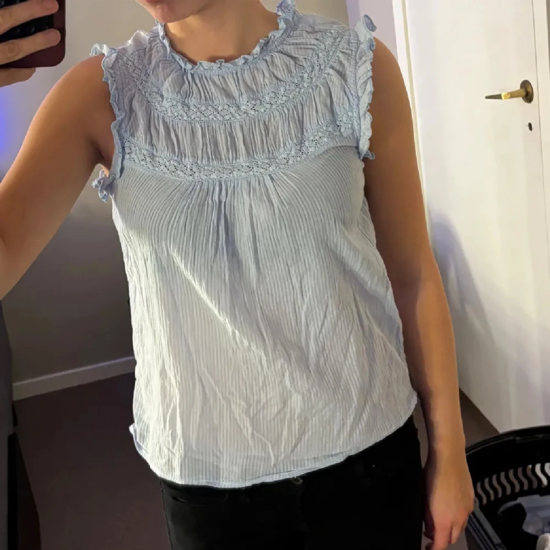 Säljer en ljusblå blus med fina spetsdetaljer och volang vid axlarna. Blusen är ärmlös och har ett romantiskt uttryck med tunna ränder och rundad hals. Perfekt för vår och sommar!