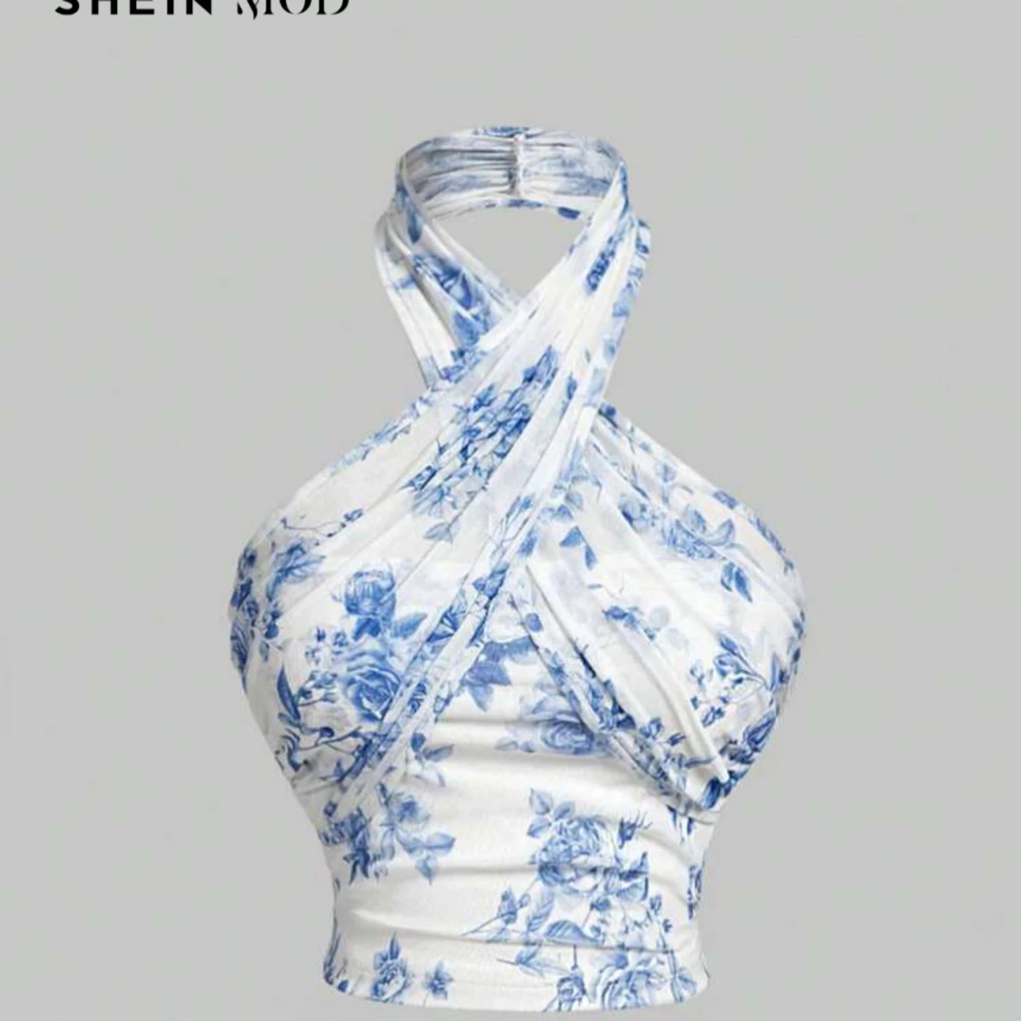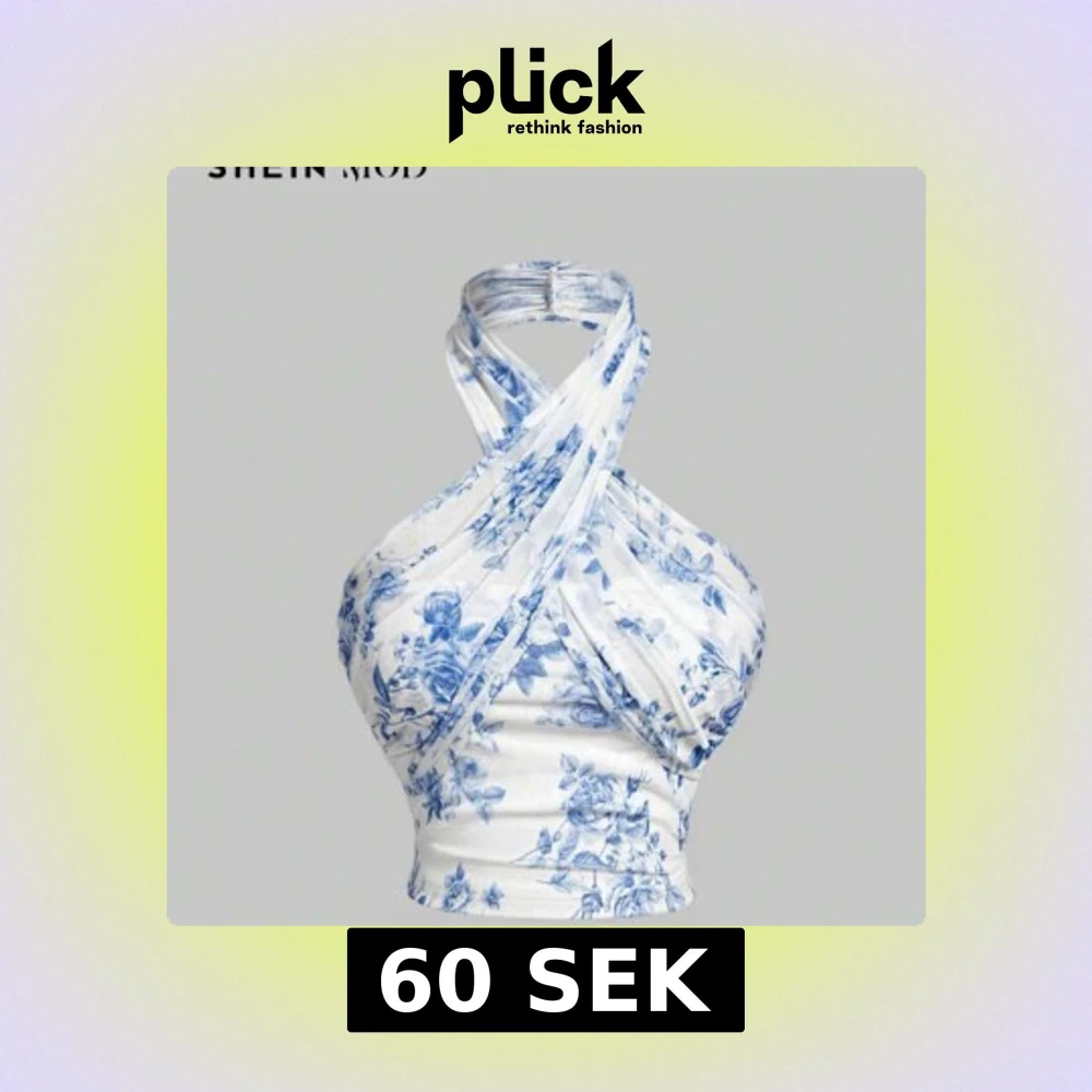 Säljer en snygg halterneck topp från SHEIN i vitt med blått blommigt mönster. Helt oanvänd endast testad en gång, prislapp kvar. Toppen har omlott-design och är ärmlös med en croppad passform. Perfekt för sommardagar och fester!