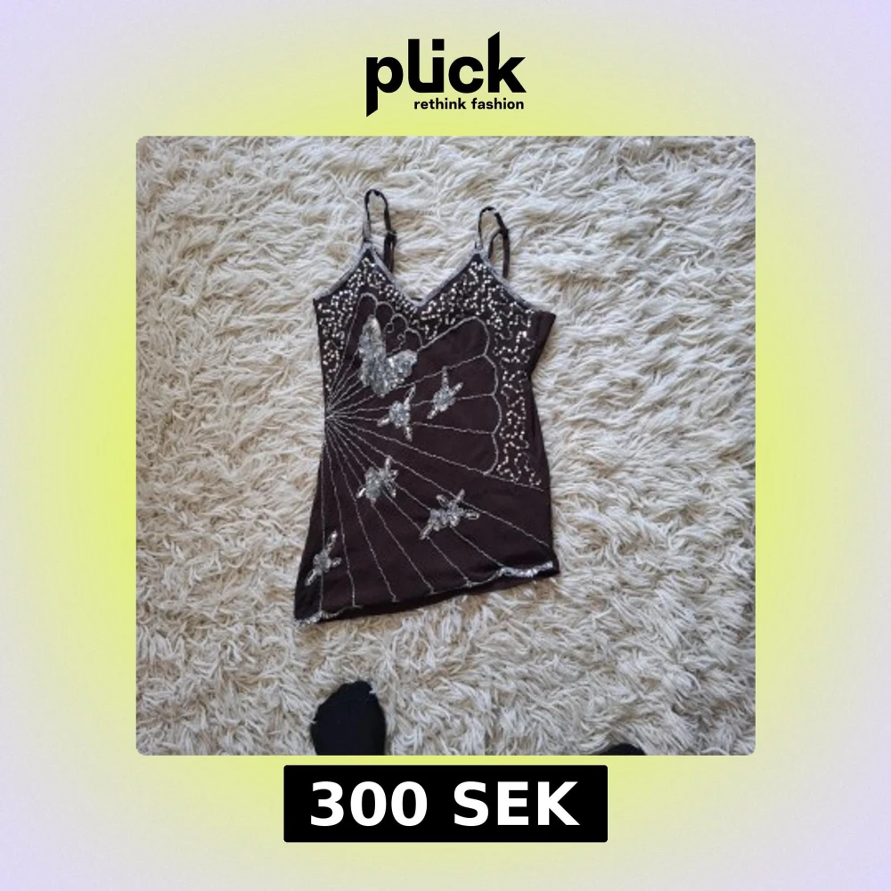 Säljer ett brunt linne med smala axelband och v-ringning. Framsidan är dekorerad med silvriga paljetter och broderier i form av fjärilar och stjärnor som ger en riktigt unik look. Perfekt för dig som vill sticka ut med coola detaljer och glittrig vibe.