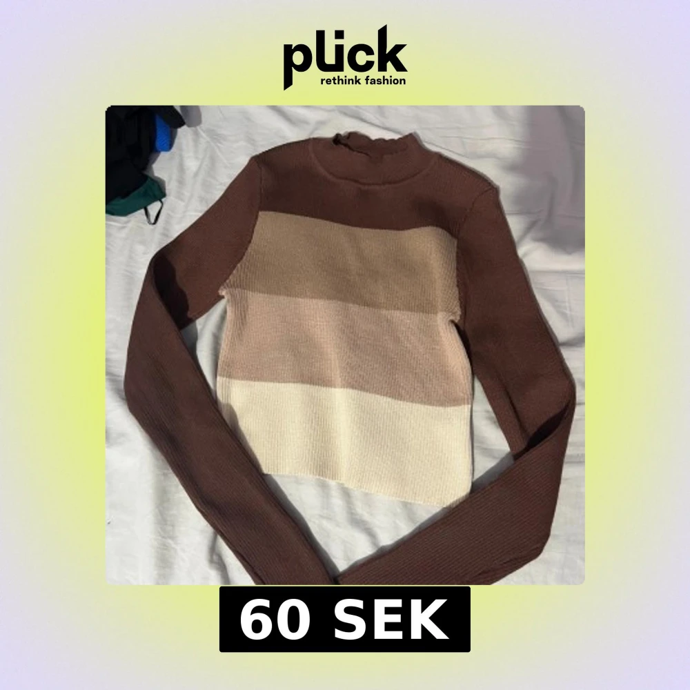 Säljer en mysig stickad topp med breda ränder i brunt, beige och krämvitt. Den har långa ärmar och en hög hals.Passar utmärkt till både jeans och kjol.