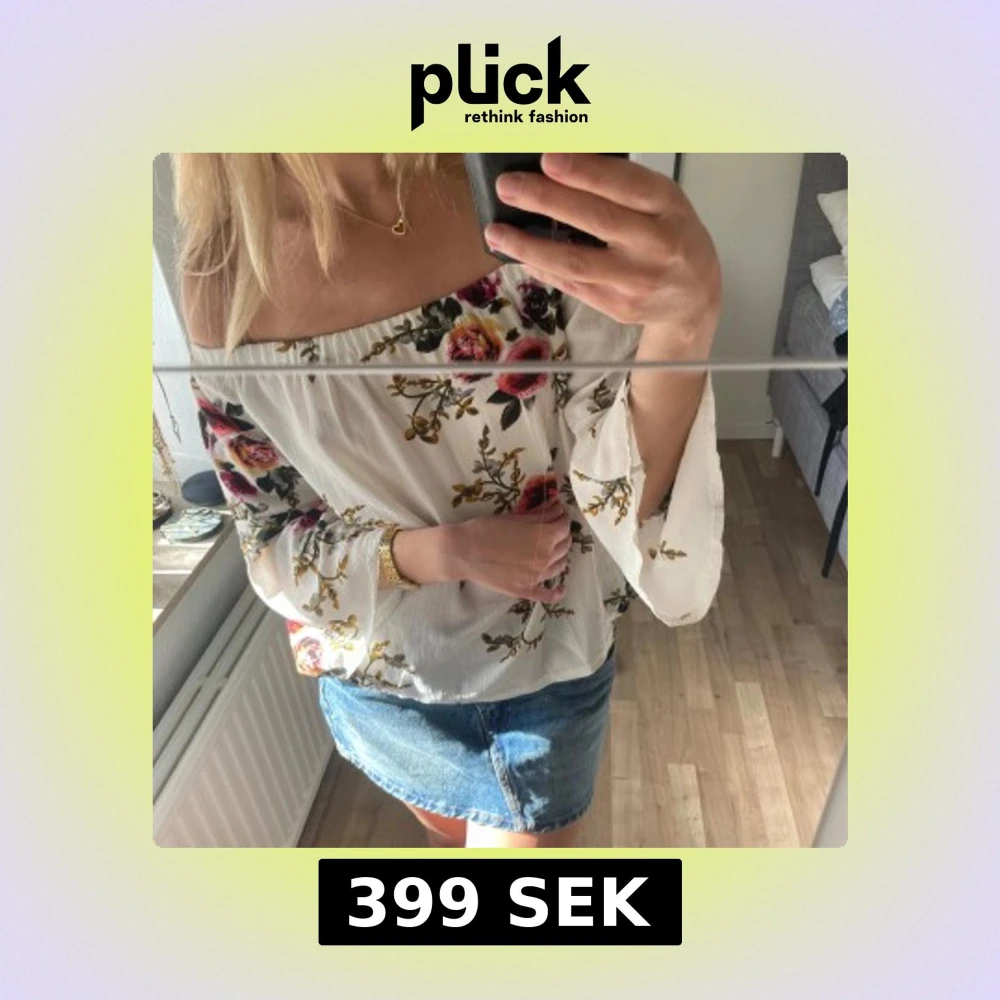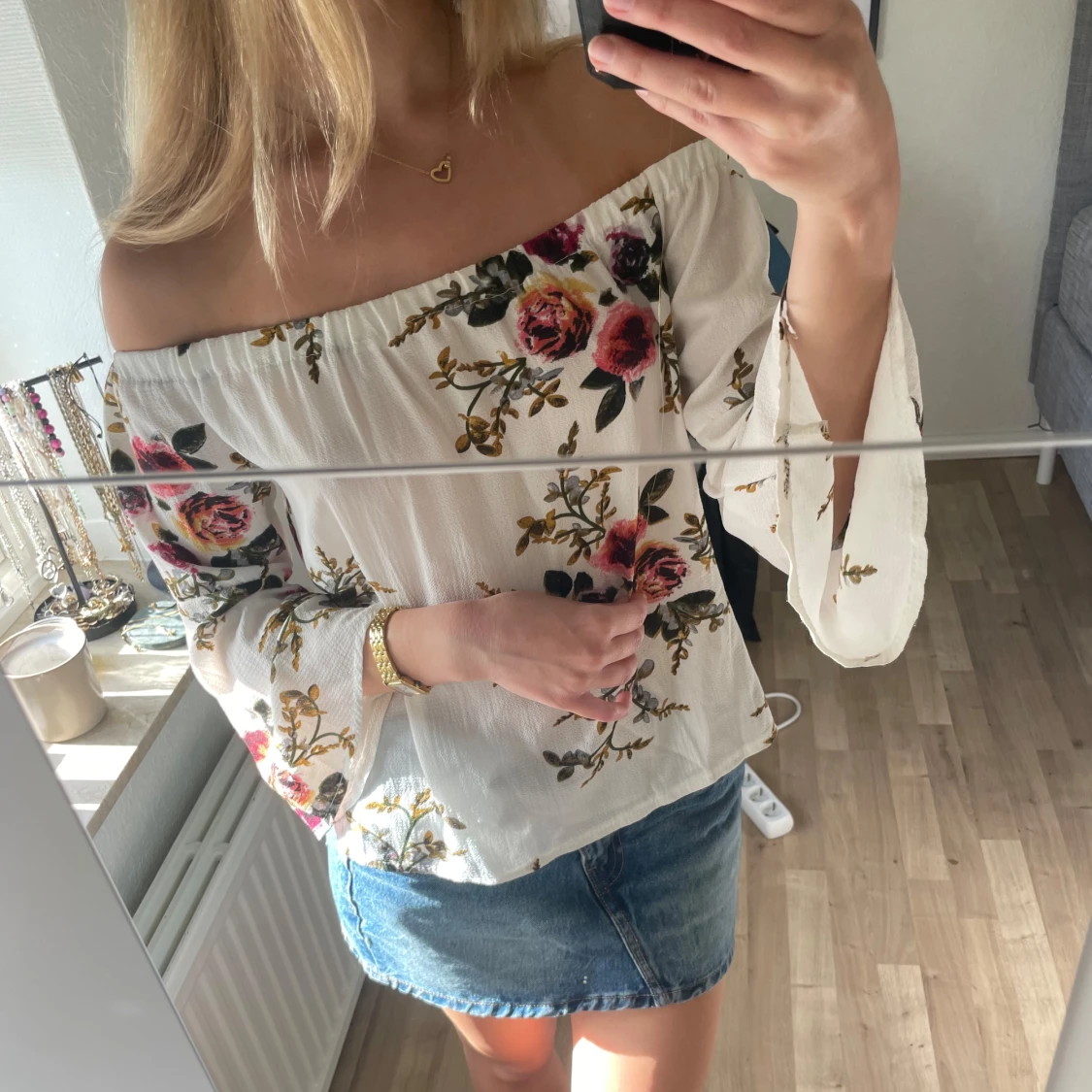 Säljer en superfin offshoulder blus i vitt med blommigt mönster i rosa, rött och grönt. Vida ärmar och luftig passform, perfekt för vår och sommar. Snygg till både jeans och kjol! 🌸