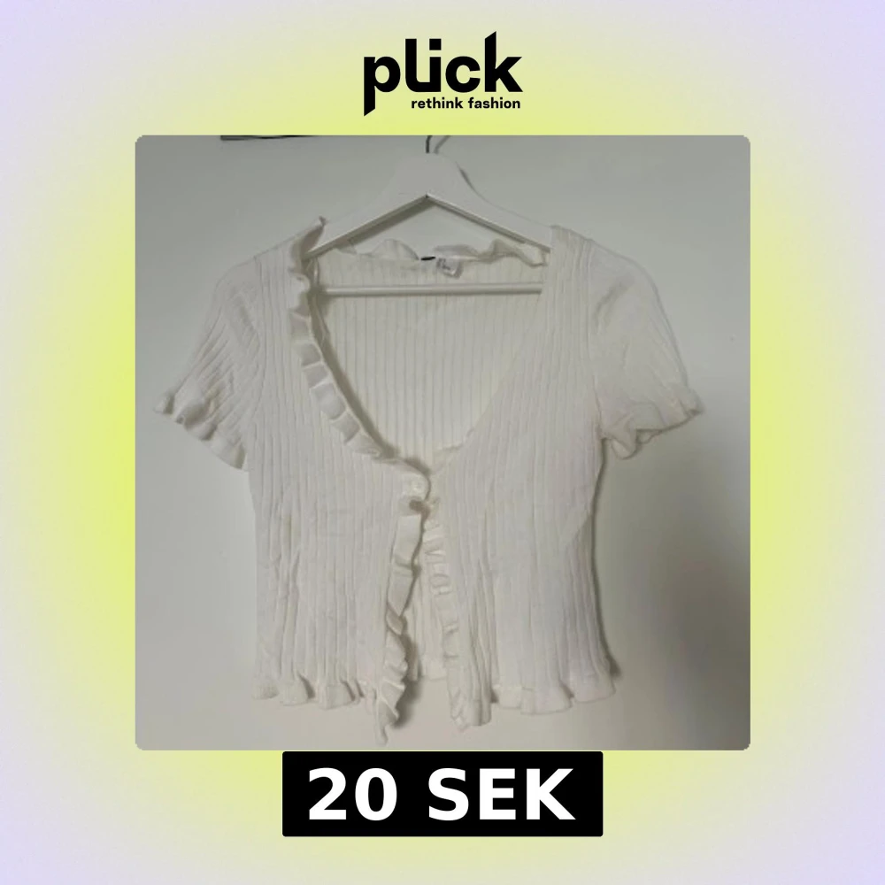 Supersöt vit ribbad blus med korta ärmar, v-ringning och knappar framtill. Volangdetaljer längs halsringning, ärmslut och nederkant ger en romantisk vibe. Perfekt att styla med jeans eller kjol för en fräsch look.